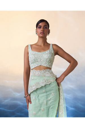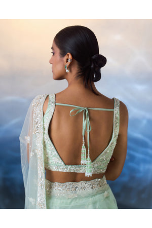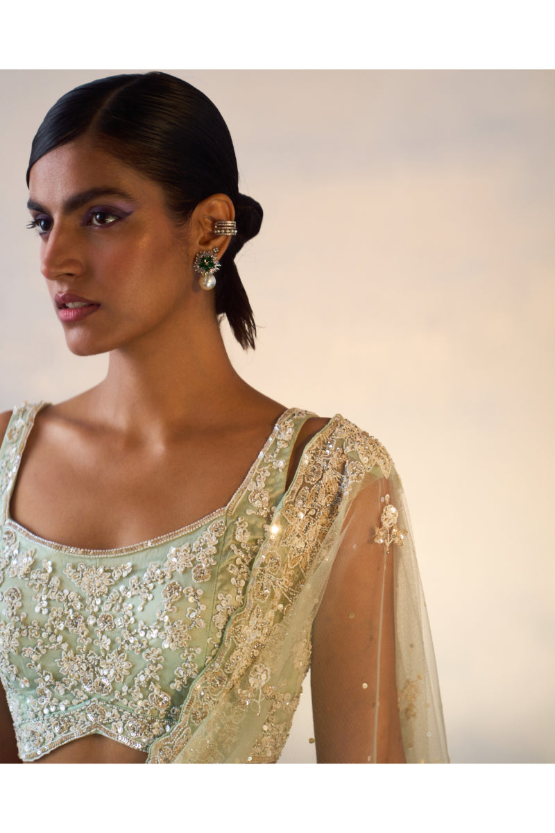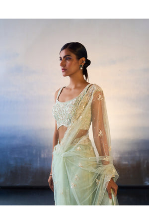 An ice blue net saree hand embroidered with cut dana, crystals, pearls and sequins.