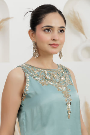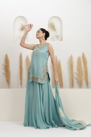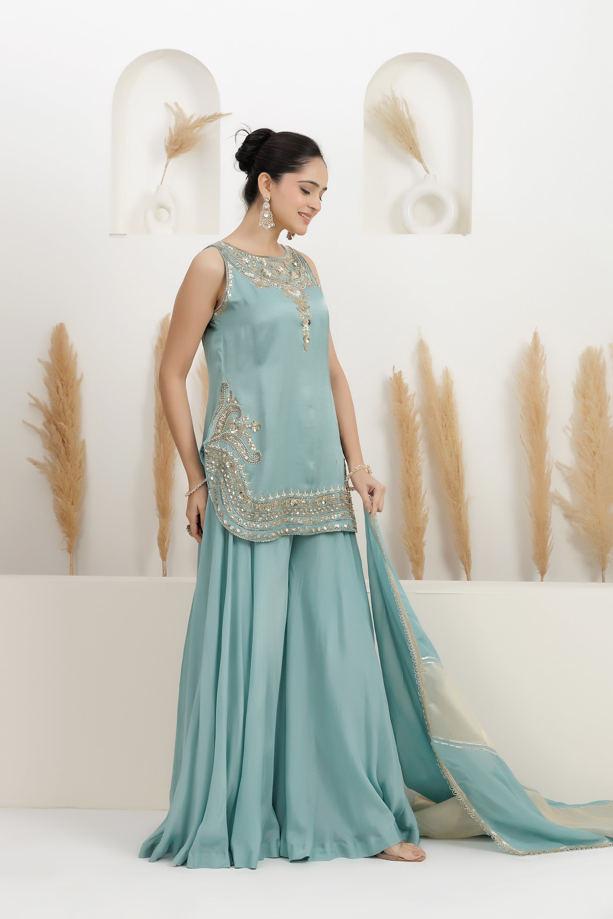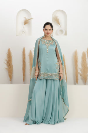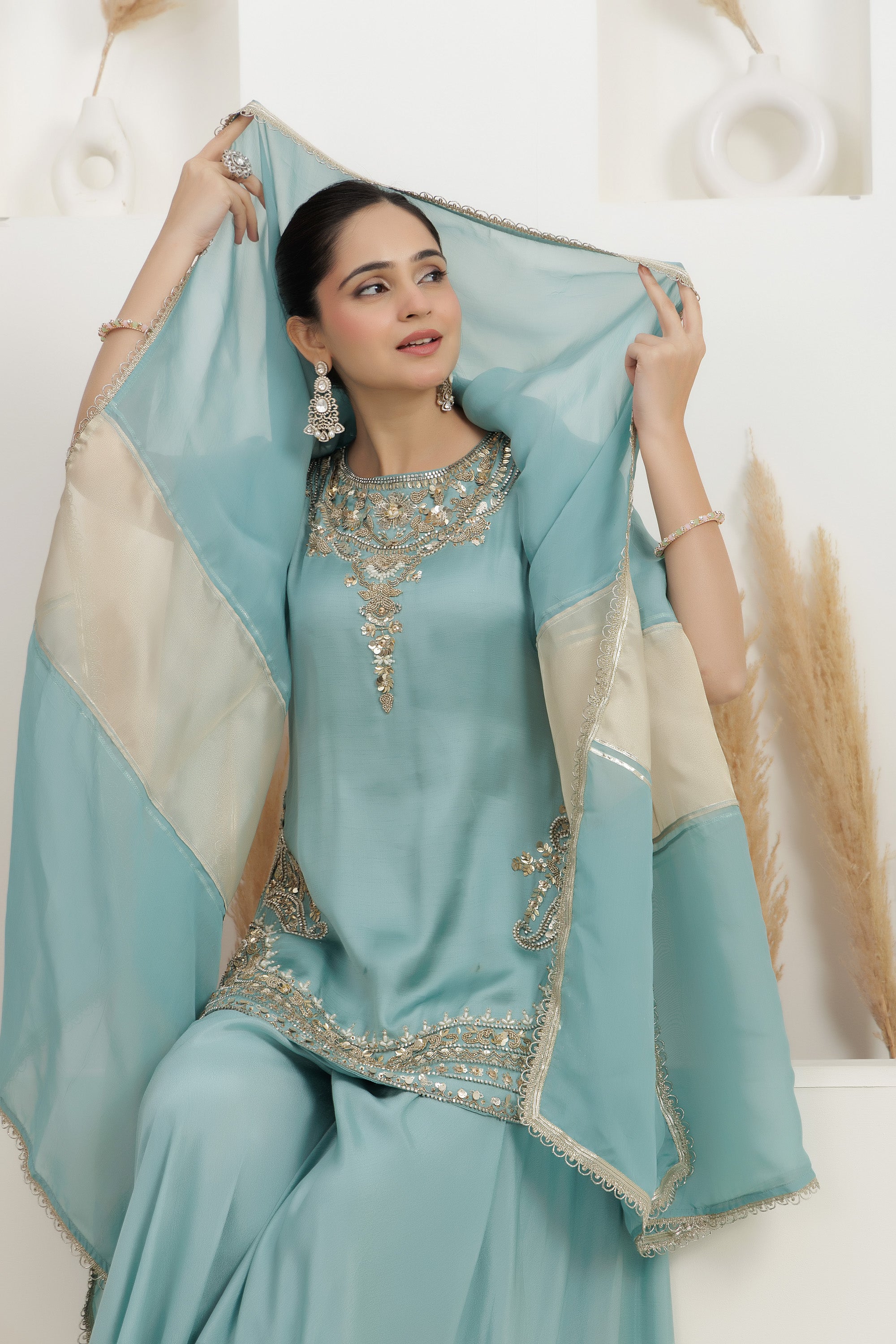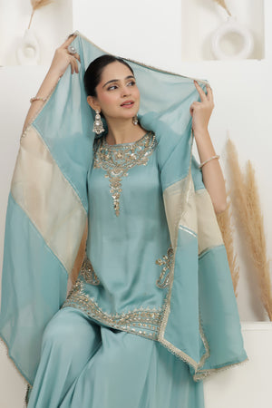 Ice-Blue Satin Silk Embroidered Sharara Suit Set