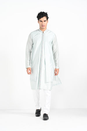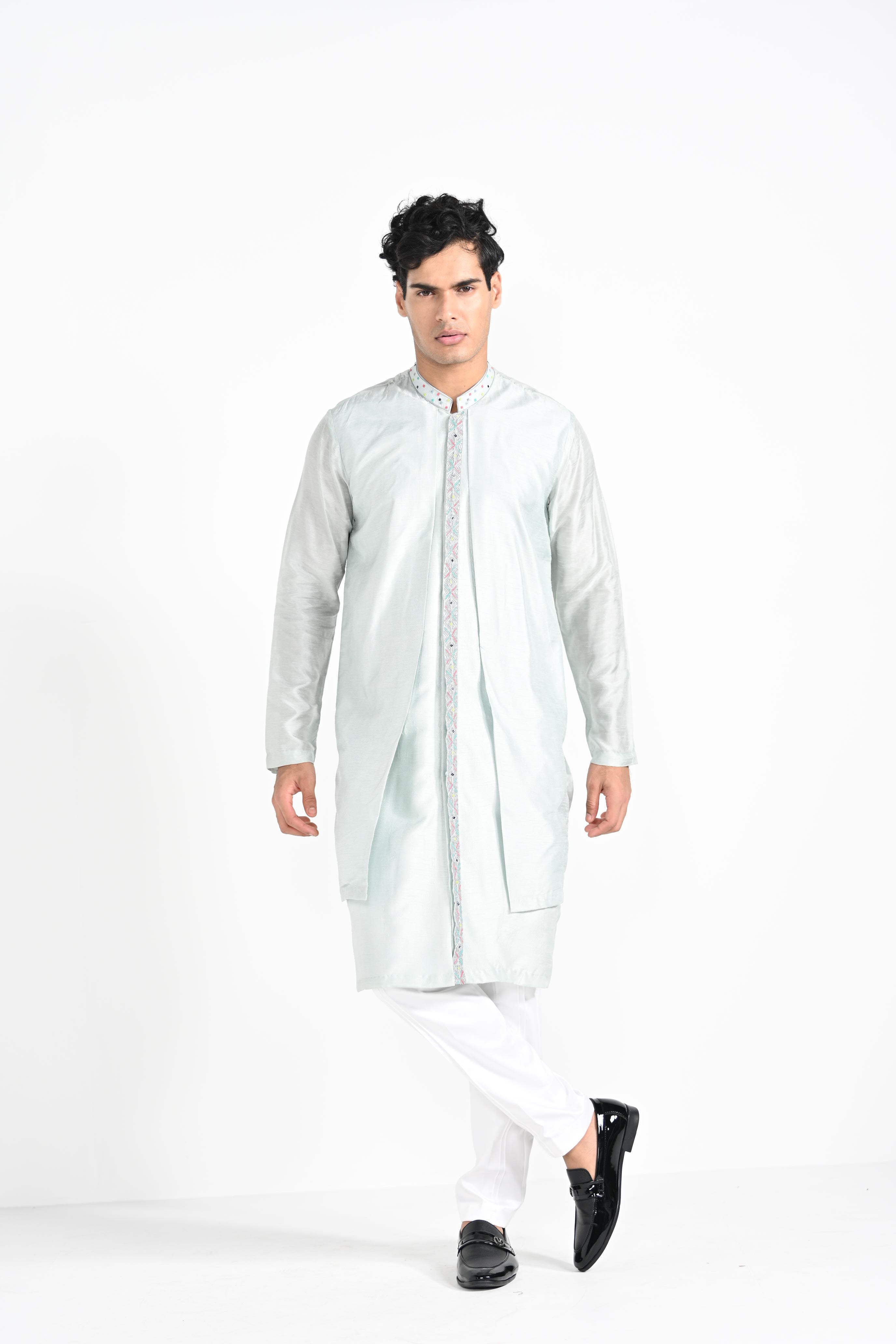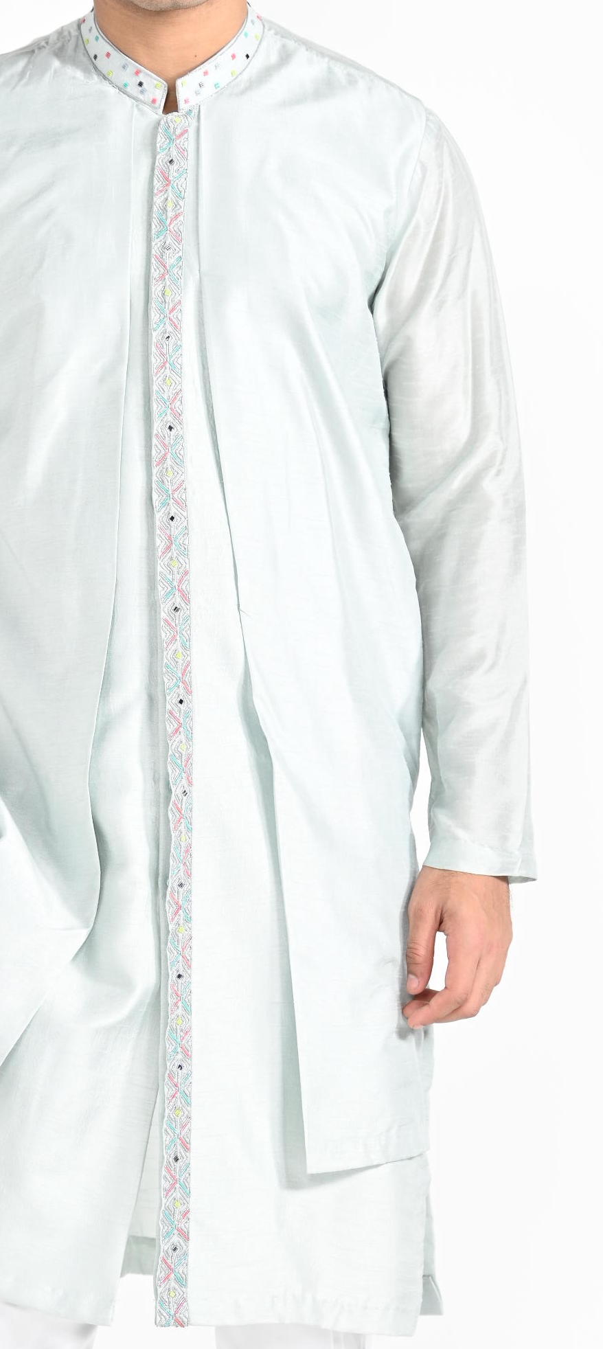 Ice blue geometric embroidered panelled kurta with layers and cutdana ,pipe work on bamberg raw silk.Paired with Ivory cream slim fit Pant Pajama. Color of the actual garment may vary due to lighting conditions during the shoot .