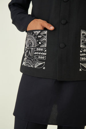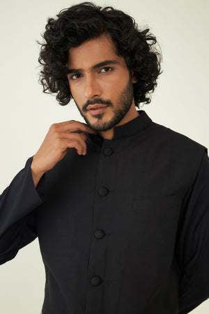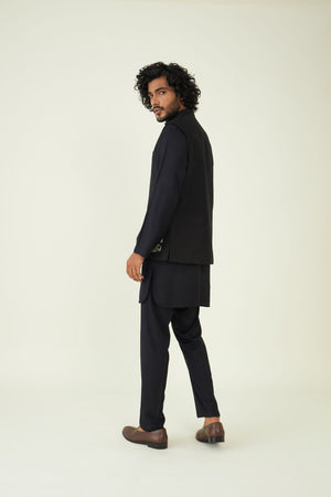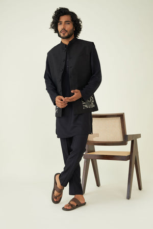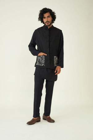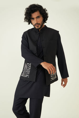 Black Abstract Embroidered Menswear Bundi. Our Black Abstract Embroidered Bundi set is a testament to the marriage of artistry and elegance. It's a harmonious ensemble that reflects your impeccable taste. You can always pair the Bundi set with a tonal kurta & pants.