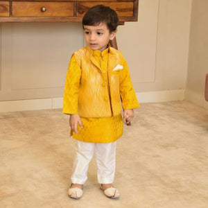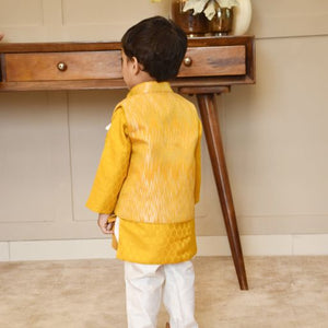 Elevate your little boys style with our Ikat Printed Nehru Jacket Set. The soft lining used in the Jacket, along with self-buttons, adds a touch of sophistication. Paired with a Chanderi Kurta featuring cotton base lining and complemented by white pants, this ensemble is a very elegant choice for any festivities.