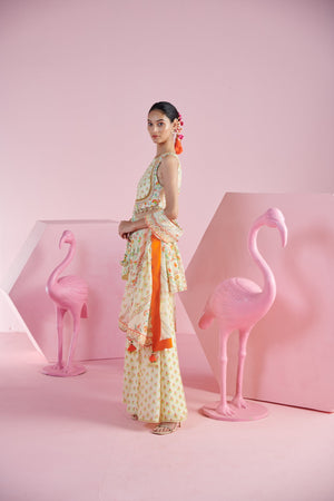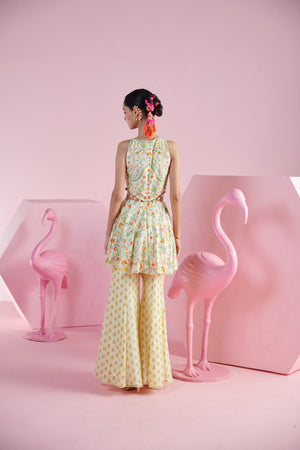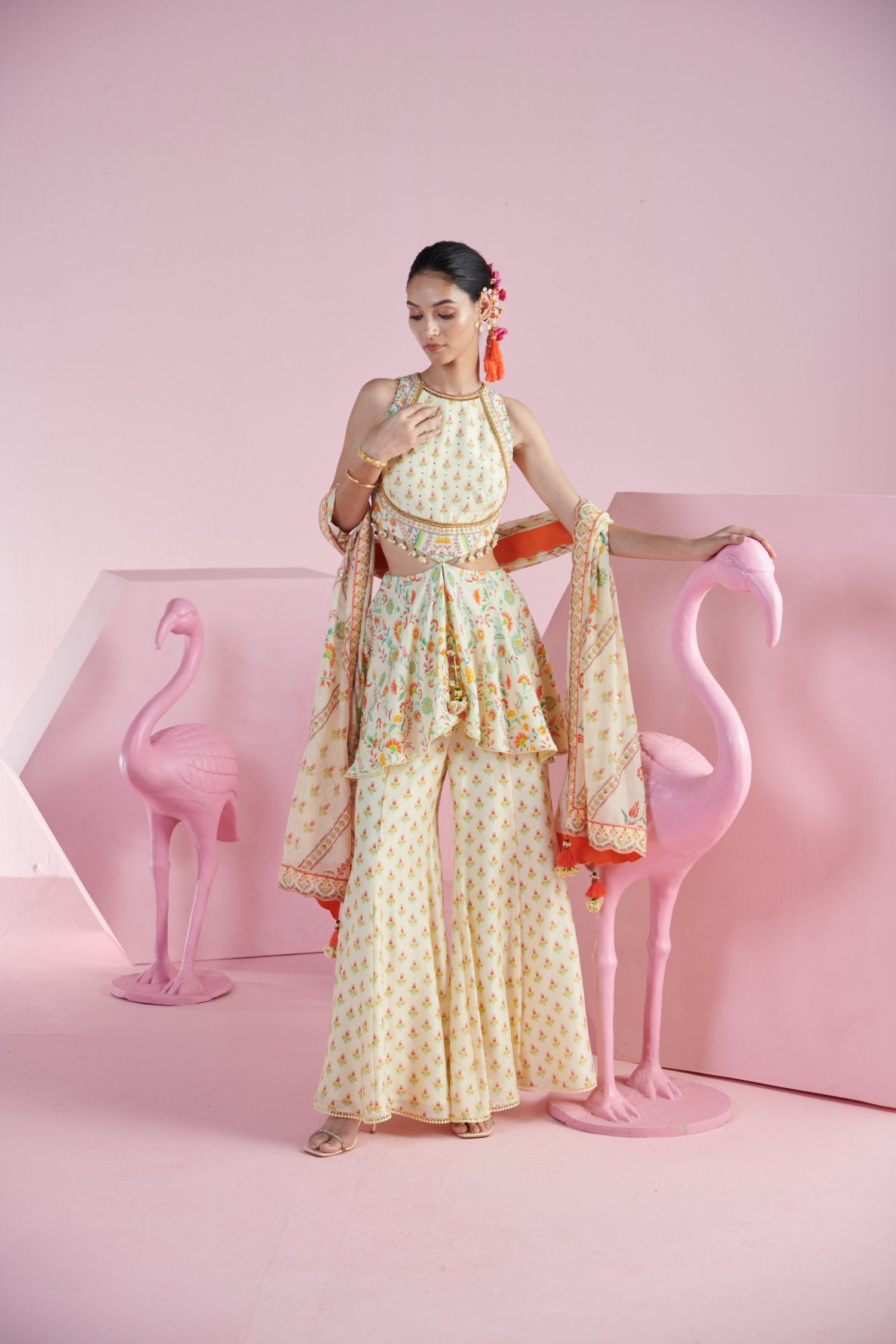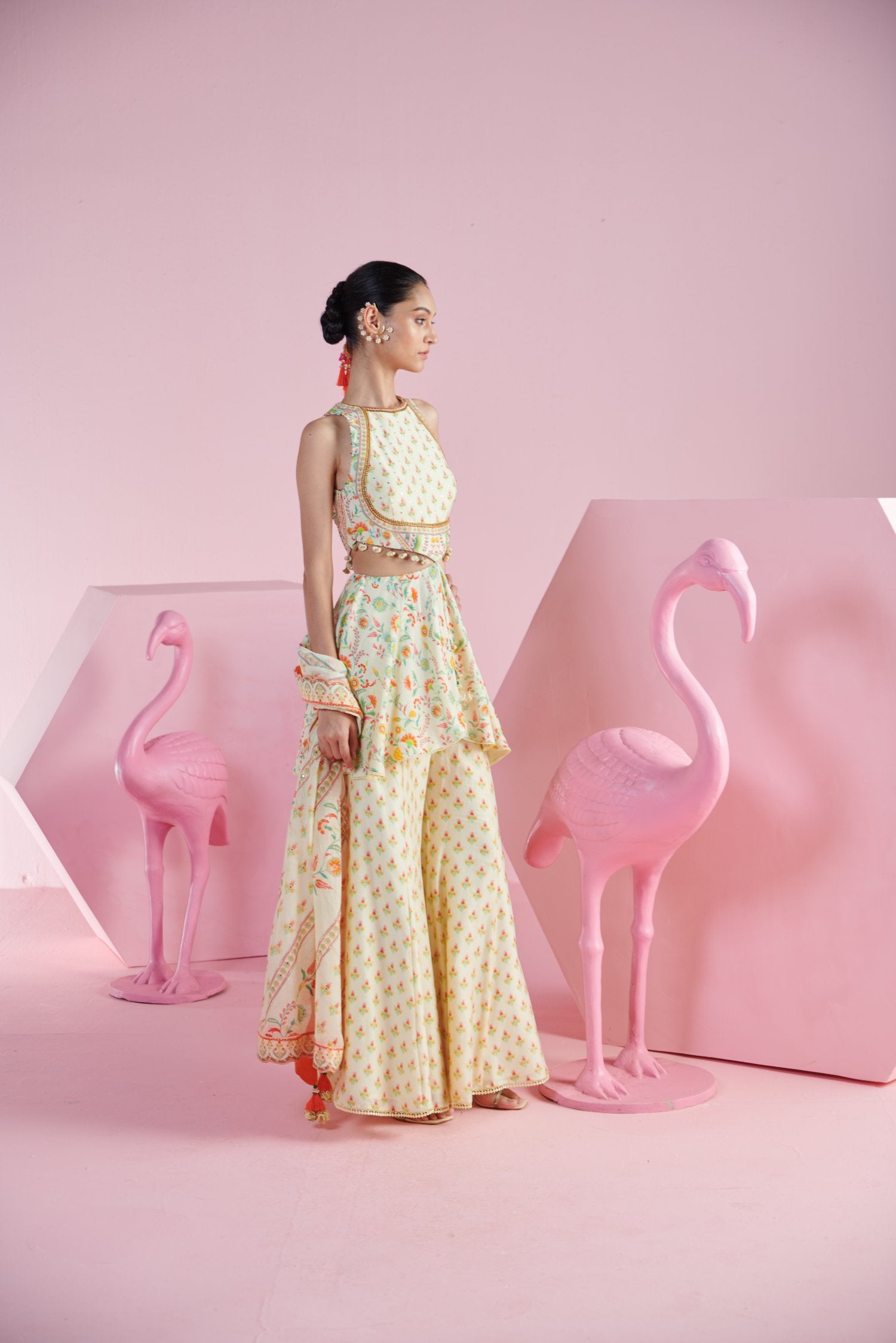 Brighten up your wardrobe with the Lemon Zest ensemble, featuring a lively lemon-printed peplum top that combines playful charm with sophisticated design. The top boasts unique cut-out detailing and decorative tassels and embroidered detail adding a modern twist to its classic silhouette. Paired with a matching printed sharara, this outfit offers a graceful, flowy look that enhances movement and comfort. The ensemble is completed with a coordinating dupatta, featuring complementary prints that tie the look together. Perfect for festive occasions or elegant gatherings, this set brings a fresh burst of style and vibrancy to any event.