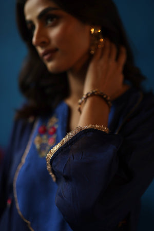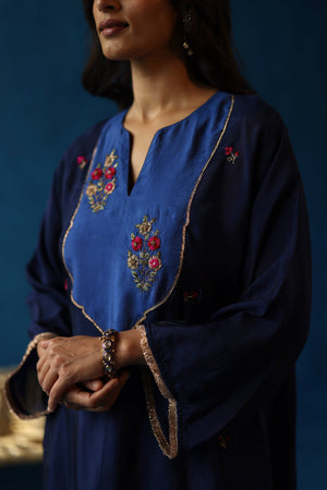 Habutai silk phiran, adorned with intricate hand-embroidered tilla, gota, resham, and zari work detailing on the yoke with contrasting colours along with gold fringes on the sleeves. Pairs well with Habutai pants.