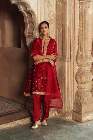 A refined ensemble crafted in pure Silk Chanderi Banarasi, paired with a traditional Dogri salwar. The kurta features a zero neckline with placket and three-quarter bell sleeves. Intricately adorned with Kashmiri Tilla and Gota Patti embroidery, highlighted with pearls and sequins, the outfit is finished with delicate gota detailing for an elegant touch.