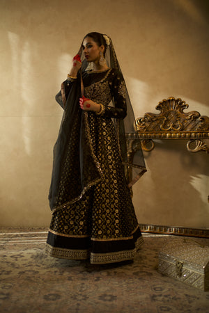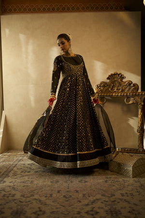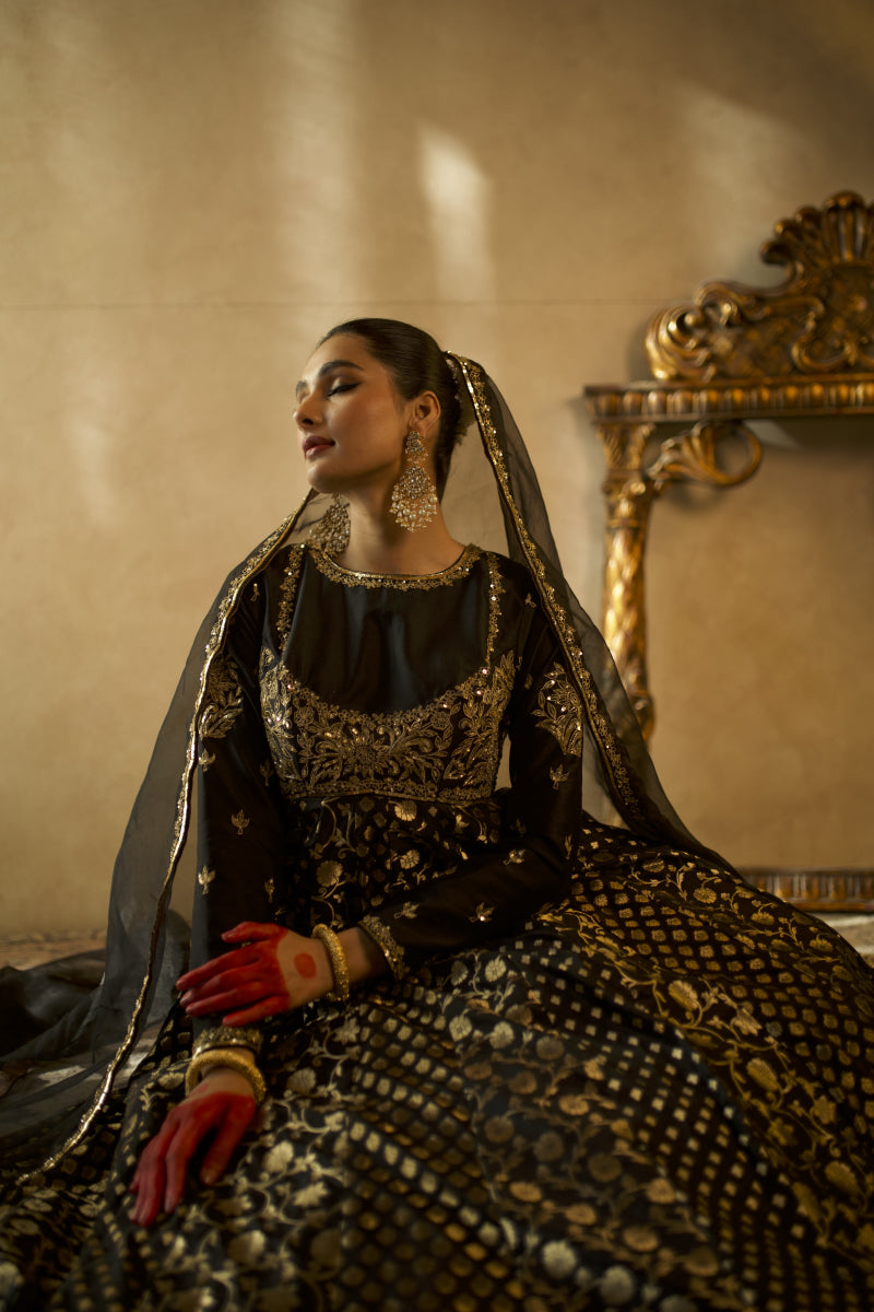 Elegant in every thread — this black banarsi silk Anarkali features delicate embroidery on the front, back, and sleeves, creating a silhouette that’s both timeless and regal. A classic redefined for modern celebrations.