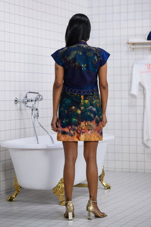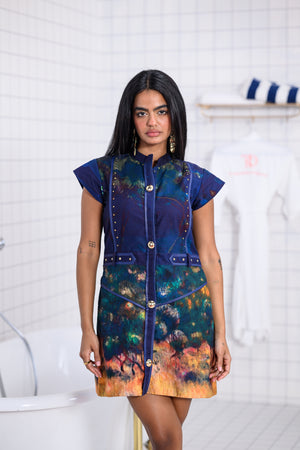 The perfect blend of structured elegance and free-spirited artistry, this dress is a canvas of cosmic blues melting into fiery dusk. A deep navy bodice with a modern shirt-style front and a structured collar brings a bold, confident feel. Cap sleeves and angular leather detailing adds a chic, contemporary touch, while the exposed front placket buttons create a striking style line that elongates the frame. Sharp matching leather piping traces the seams, adding depth and definition to the structured yet fluid silhouette.A perfect day-to-night statement piece, this dress is an effortless fusion of modern tailoring and dreamy, nature-inspired hues.