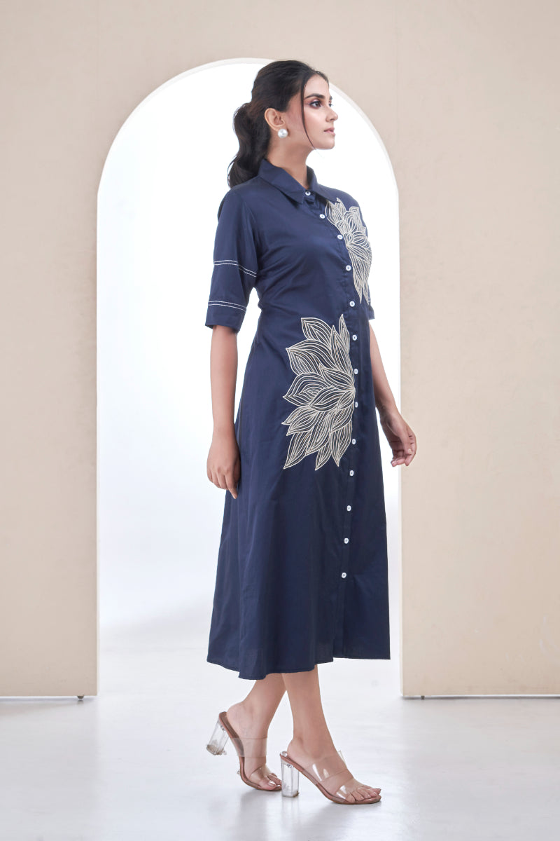 A tailored navy shirt dress elevated with bold threadwork florals in ivory. Buttoned through and cut in a flattering midi length—perfect for everything from workwear chic to weekend brunches.