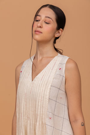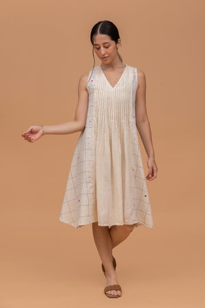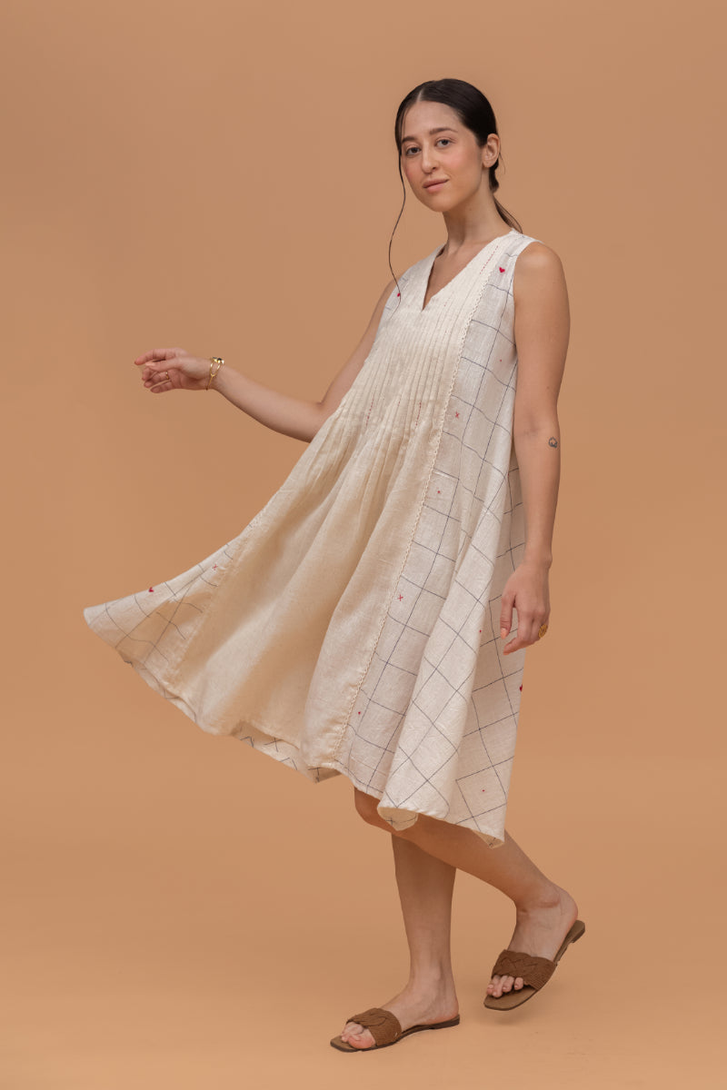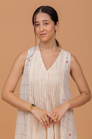 Crafted From Handwoven Kala Cotton, This Elegant Dress Combines Timeless Style With Slow Fashion. The Soft Pleats And Cute Heart Embroidery Add A Playful Yet Refined Touch, Making It Perfect For Everyday Wear. The Intricate Lace Detailing And Kantha Stitch Bring A Beautiful Charm And Artisanal Quality To The Dress, Elevating Its Design. A Must-Have In Your Wardrobe, This Dress Blends Comfort, Craftsmanship, And Sustainability, Offering A Versatile Piece For Any Occasion.