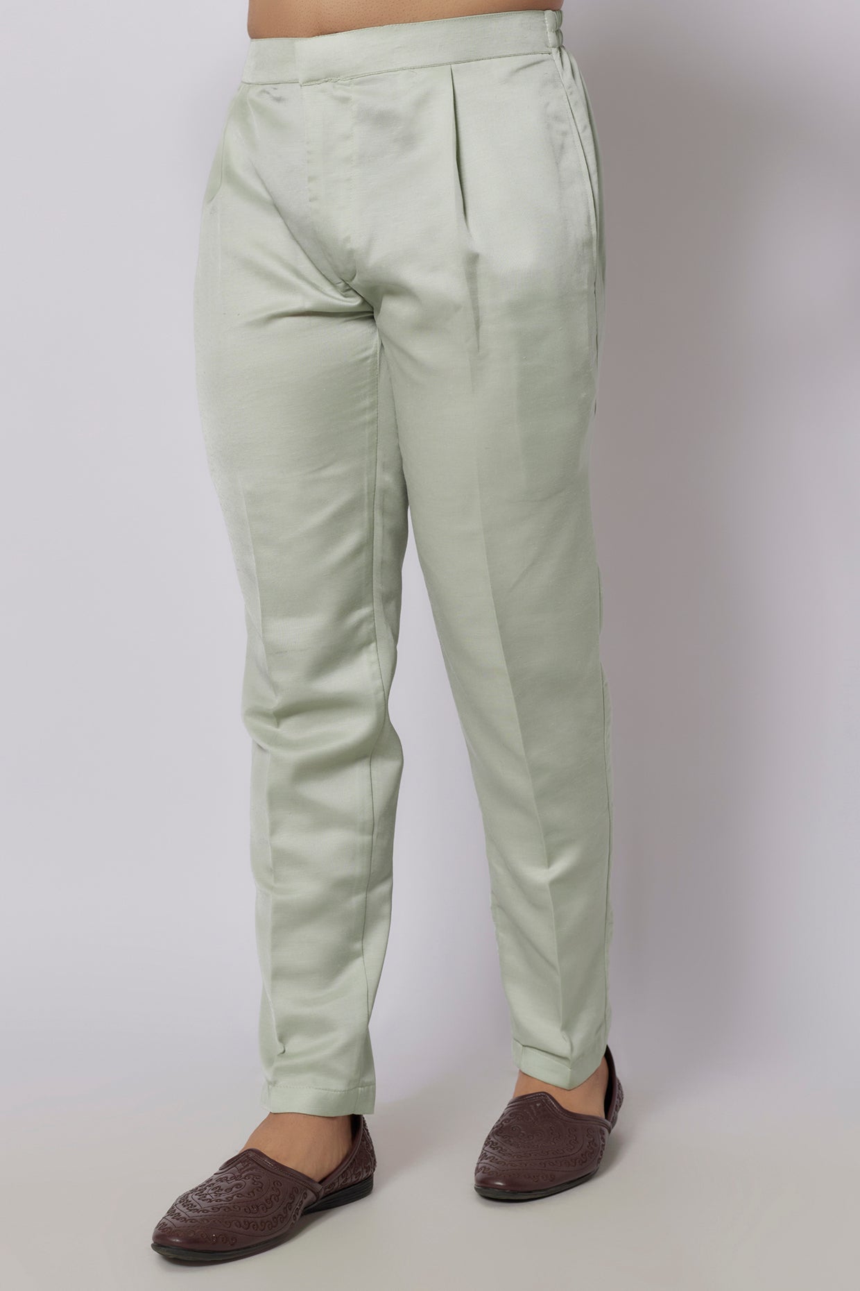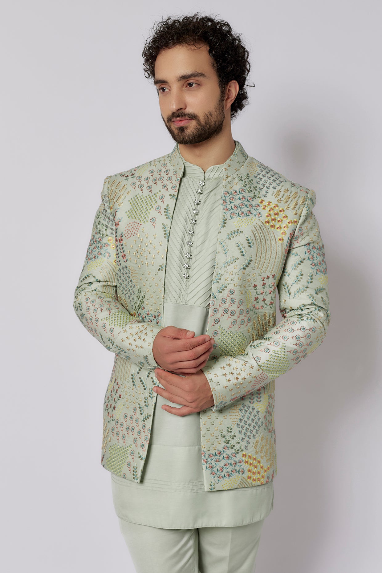 Celadon Green Linen Satin Embroidered Indowestern Jacket Set