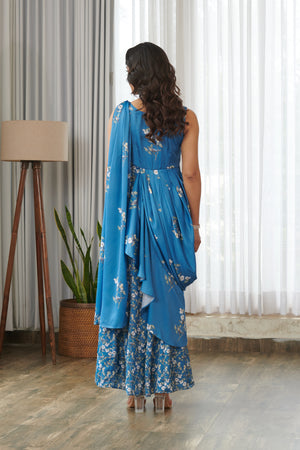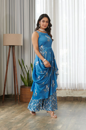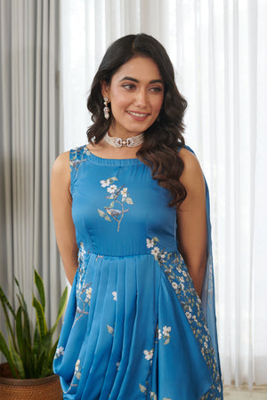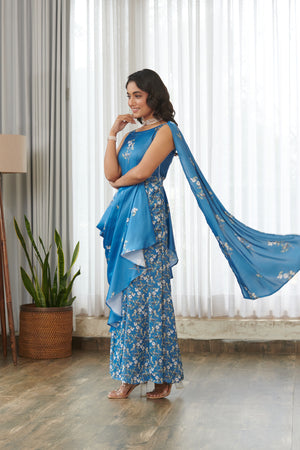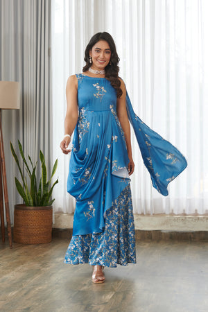 A sleeveless Swiss satin dress with playful ruffles and a draped saree-style pallu — festive yet fuss-free. Flowy, comfy, and perfect for twirling through every celebration.