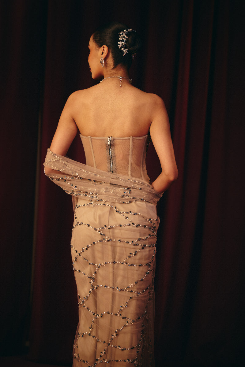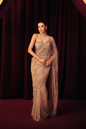 This elegant pre-draped saree features a structured, heavily embellished corset paired with a soft, fluid drape adorned in delicate all-over bead and sequin work. The sheer palla adds graceful movement and a touch of drama, while the sculpted fit highlights the silhouette beautifully. A refined choice for receptions, cocktail evenings, and contemporary bridal celebrations.