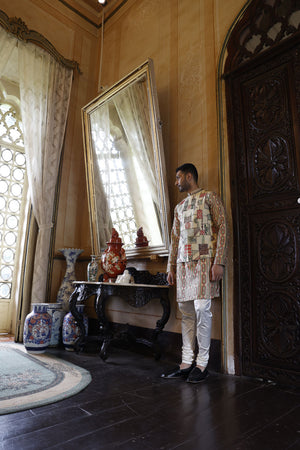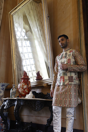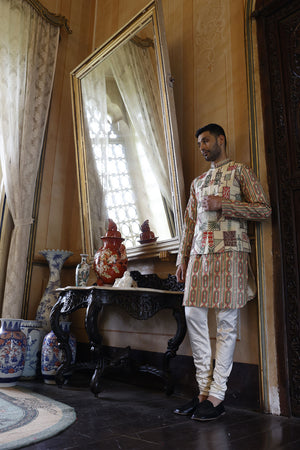 Ivory Abstract Geometric Bundi with Kurta and Churidar