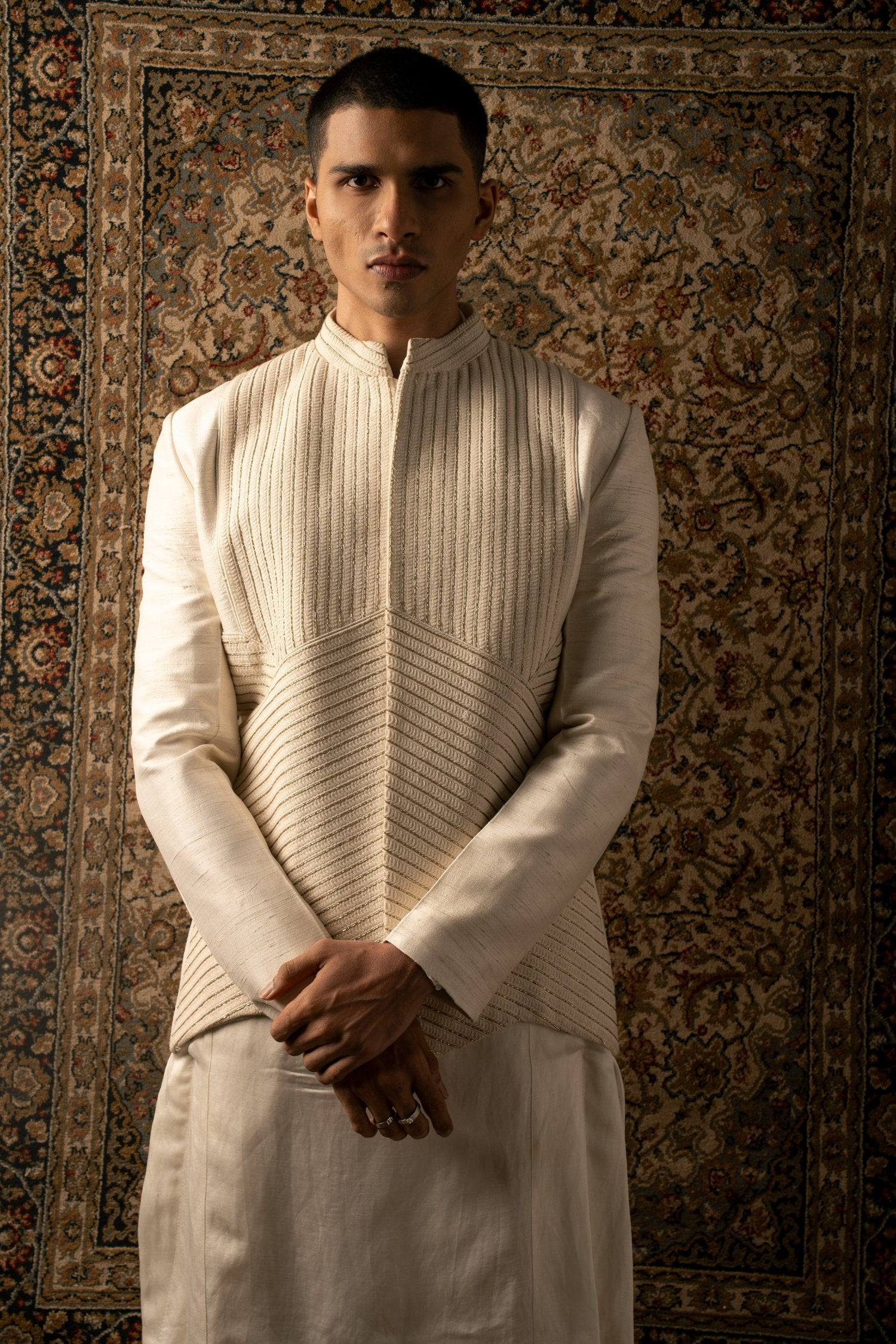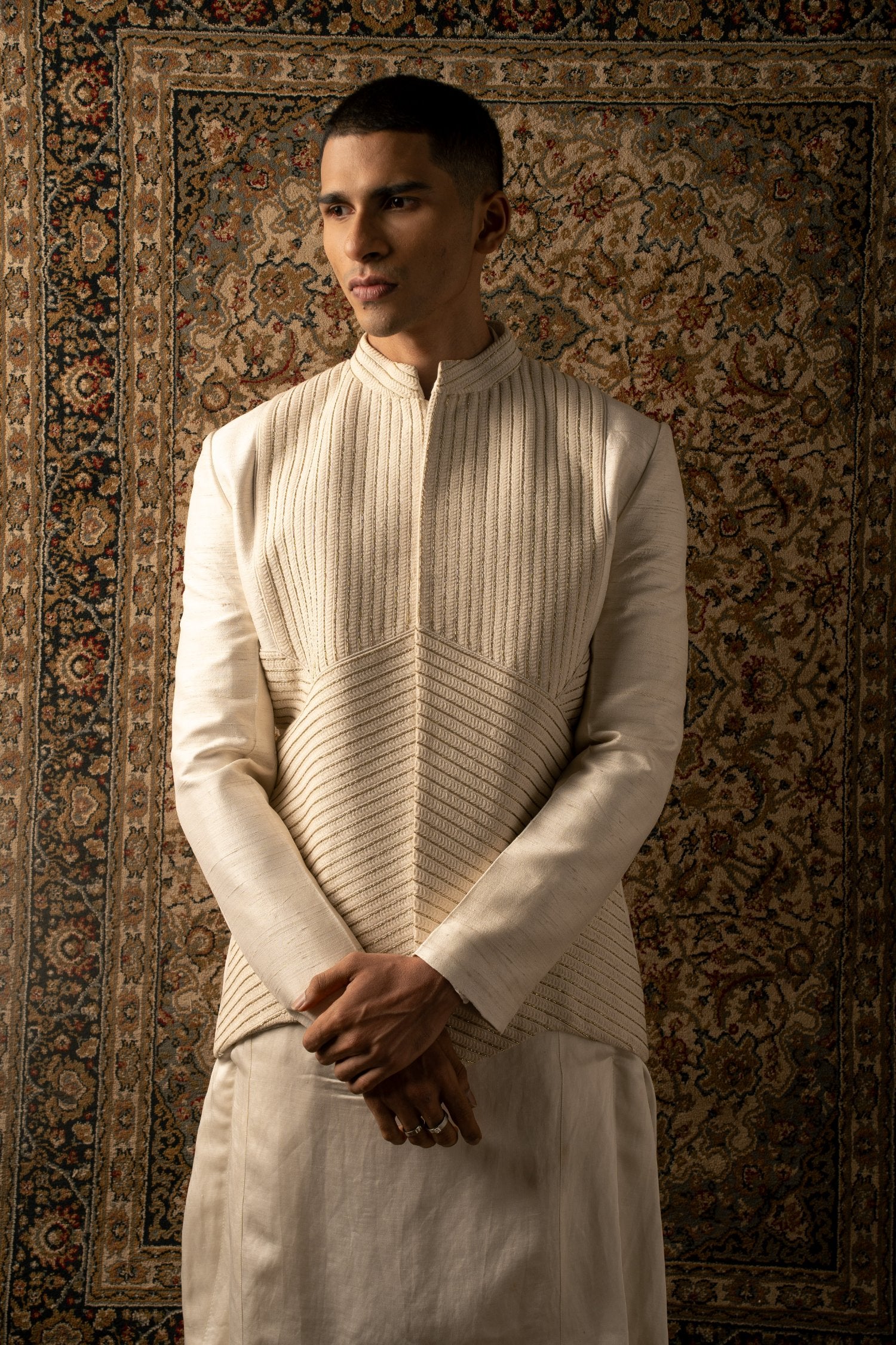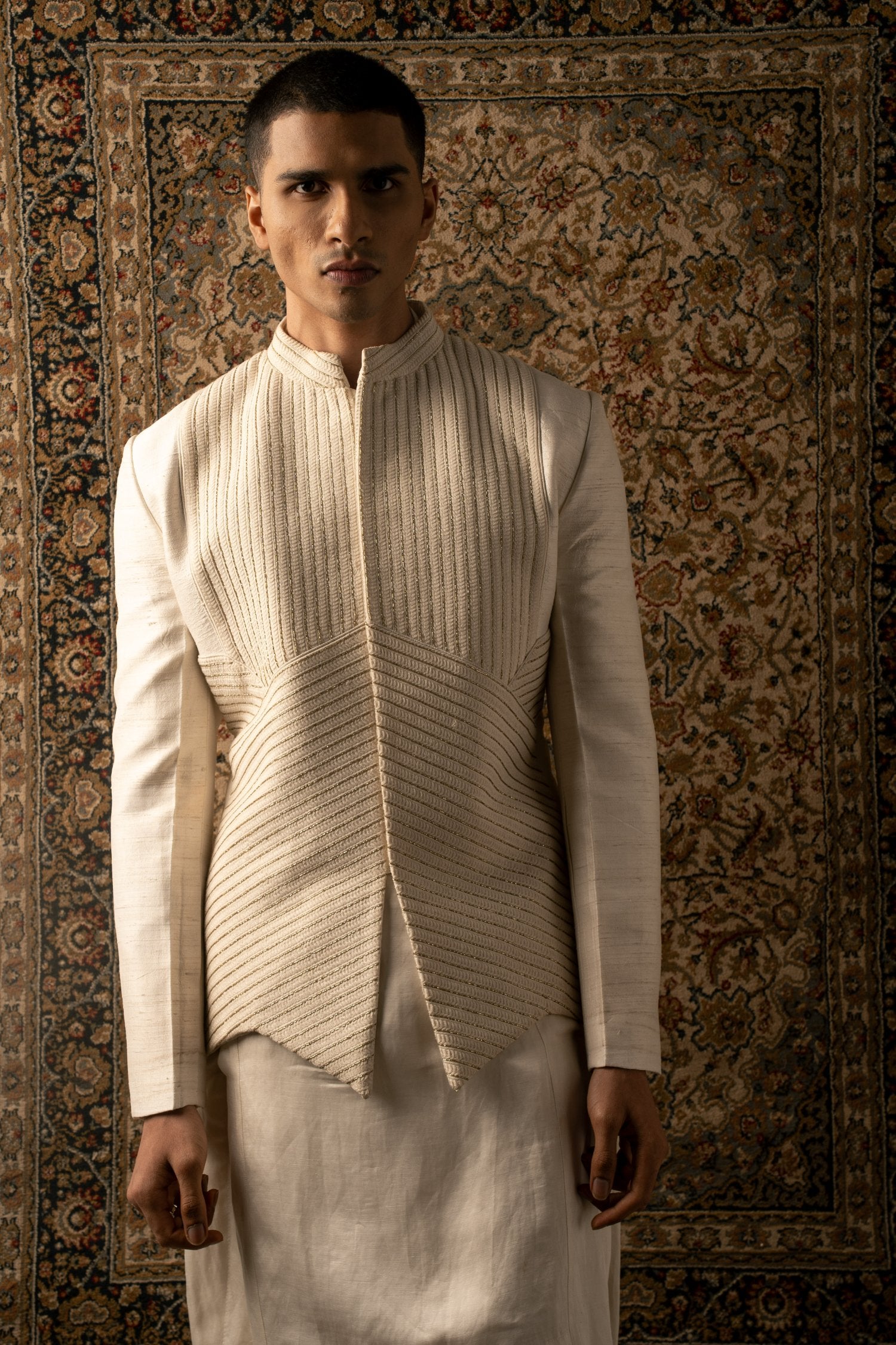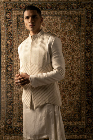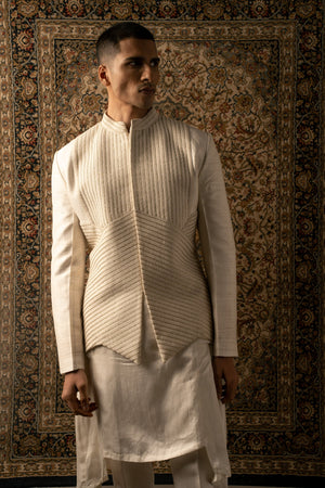 An ivory layered ensemble, crafted on raw silk, features intricate textured tonal embroidery, elevating any man's look to one of sharp sophistication, embodying the essence of a modern Indian gentleman.