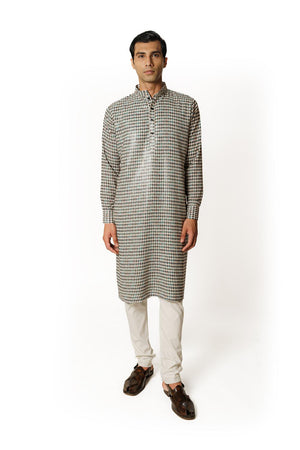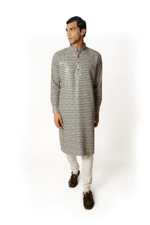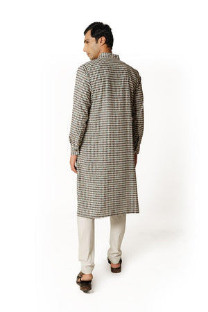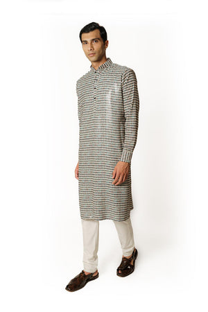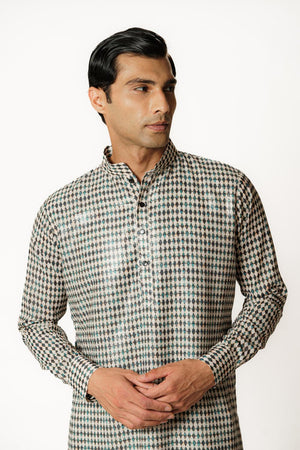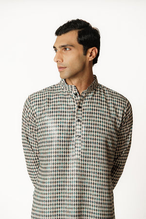 IVORY/BLACK DIAMOND PRINT 1/2 SHEETING 1/2 GORGETTE W CREPE LINING KURTA W COTTON SILK PANT