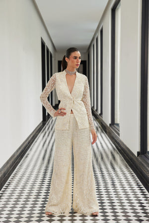 Ivory self on self net indowestern set embellished with cutdanas and sequinz. A waist slit blazer with heavy embroidered pants
