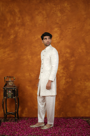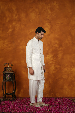 Featuring an ivory open jacket in blended silk base with embroidery. It is paired with a white cotton satin kurta and pants. Perfect attire for any festive occasion, wedding or engagement ceremony, exuding charm and elegance.