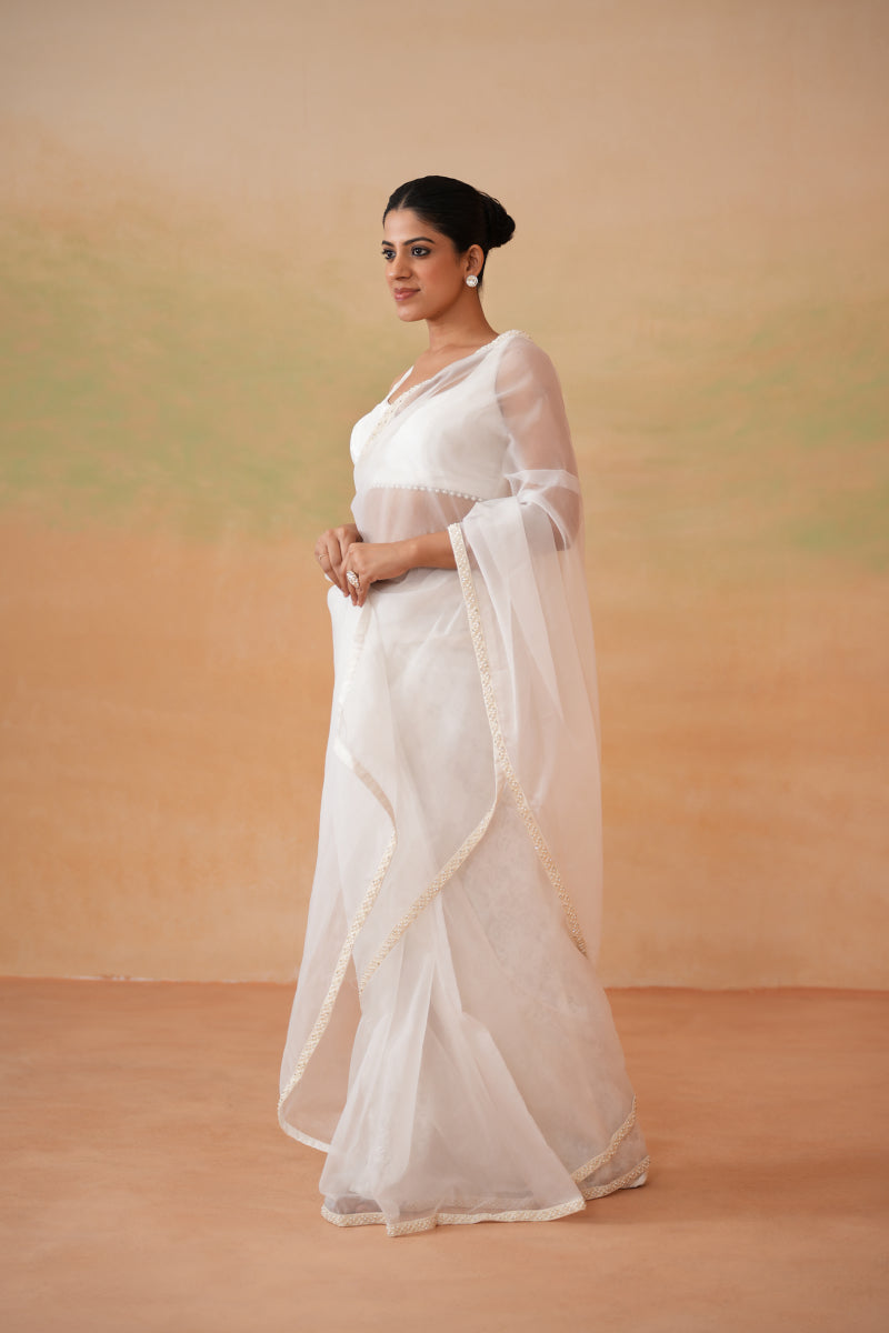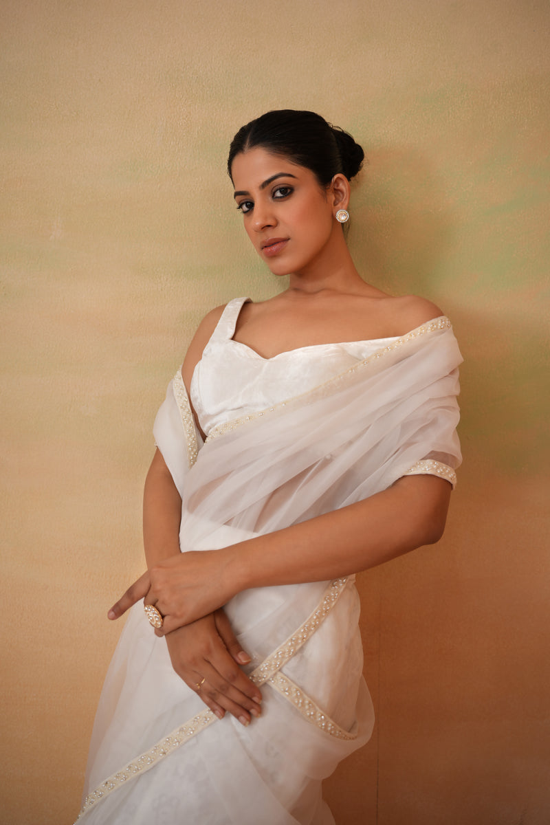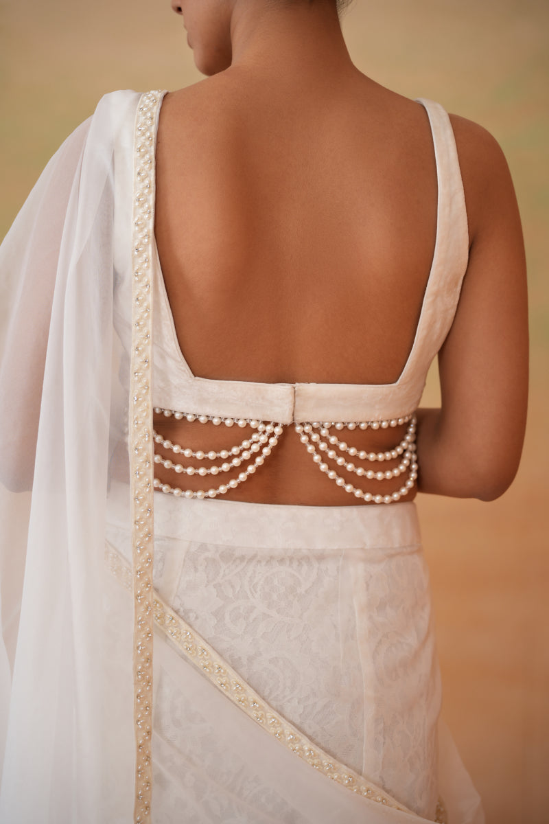 Deepika Chadha's stunning Off white velvet blouse beautifully adorned with pearls design at back. The flowy Organza stitched saree with Shand lace attached petticoat , beautifully adorned with Pearl border all around which gives you a sophisticated look and is perfect for wedding and festive season.