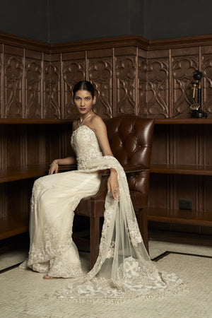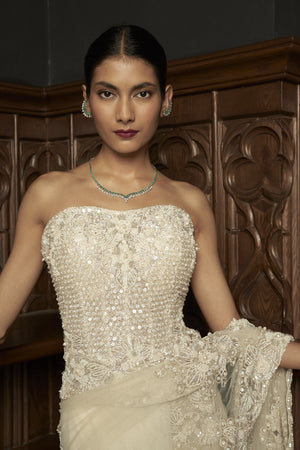 Ivory saree set with hand embellished corset blouse.. It has all over embroidery of pearls, cutdana and sequins..