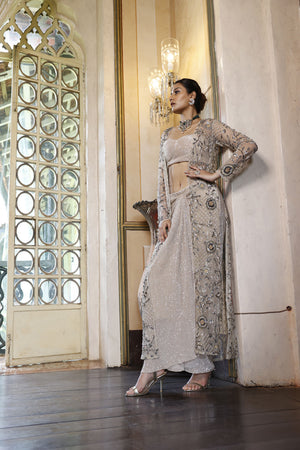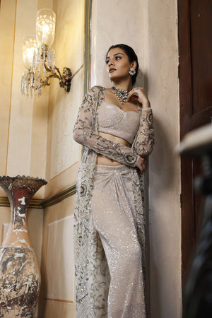 Cape: Ivory net cape with hand embroidered work all over. The cape is floor length with side slits and full length sleeves. | Corset: Beige pleated sequins corset style bustier with noodle strap and a metal zip at the back for closure. | Draped skirt: Beige pleated embroidered sequins draped skirt with waterfall pleats in the front.