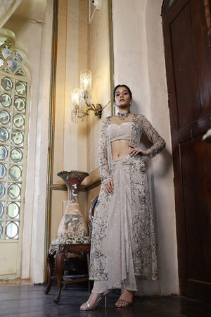 Ivory Embroidered Cape with Pleated Sequins Corset and Draped Skirt