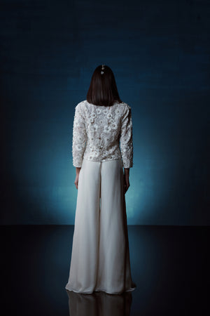 Ivory organza self on self hand embroidered jacket with floral and geometrical motifs, paired with a bstier and organza pants