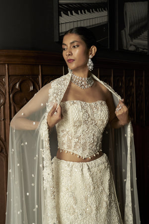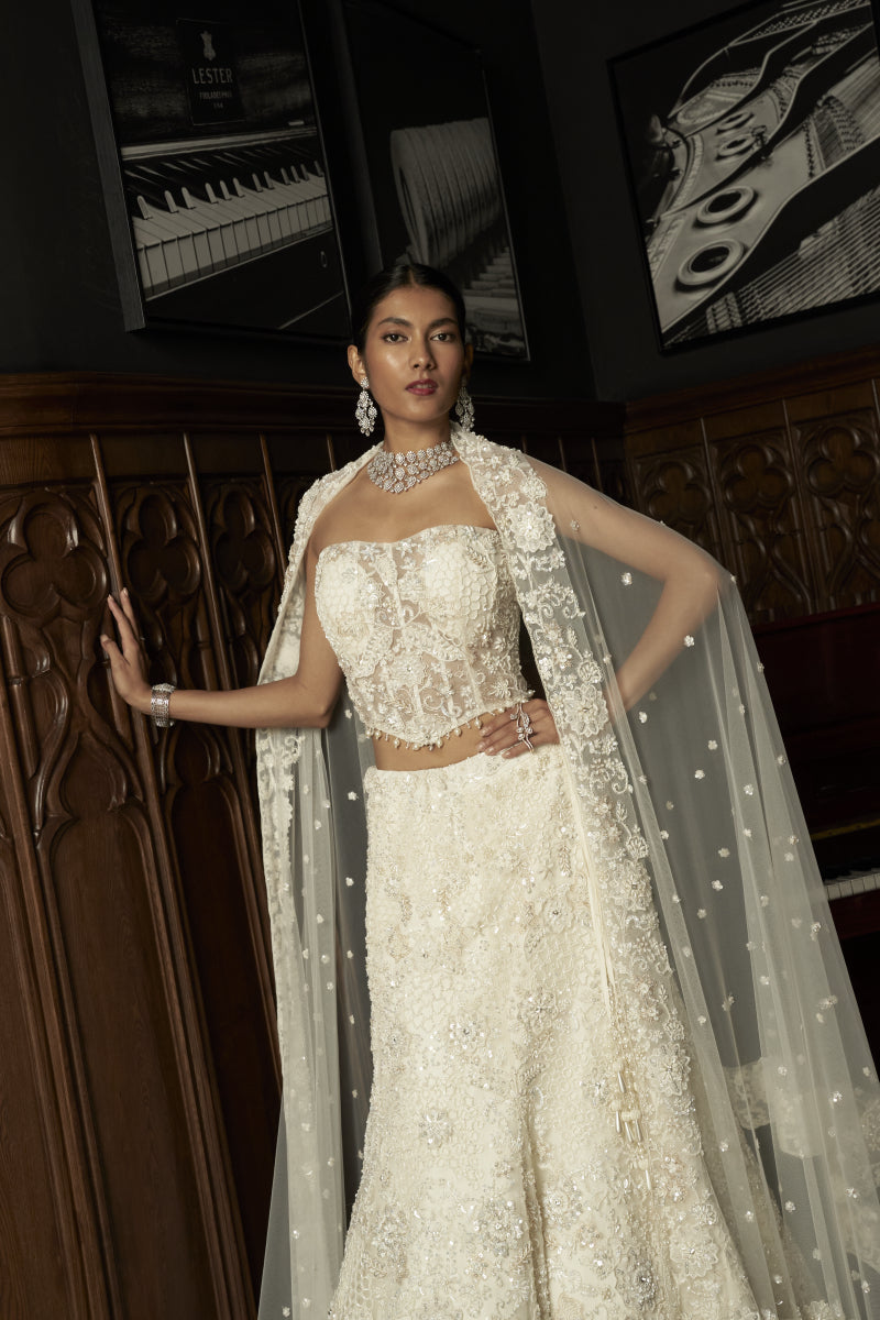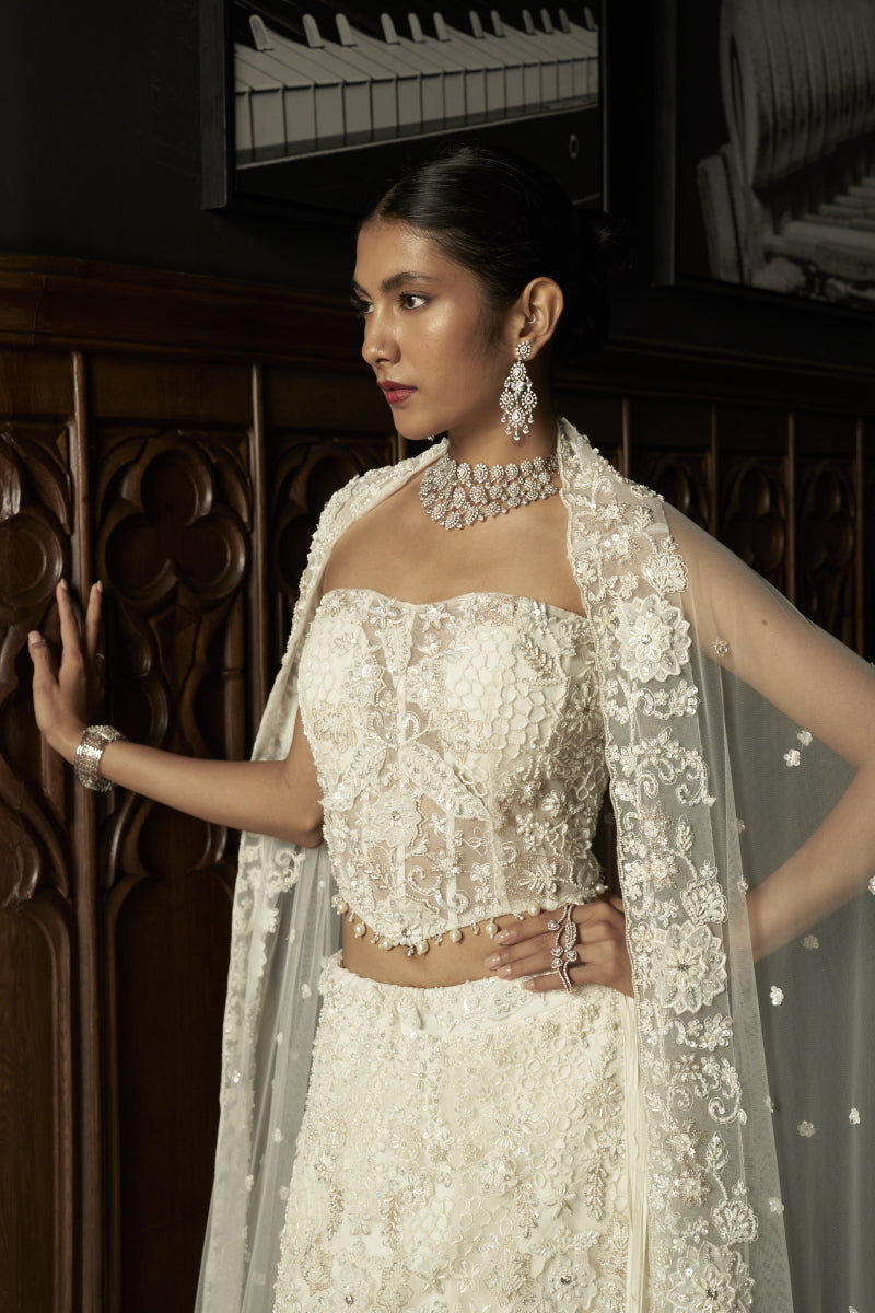Ivory net fishcut lehenga paired with corset blouse and dupatta. It has all over 3d applique work, sequins and cutdana hand embroidery.