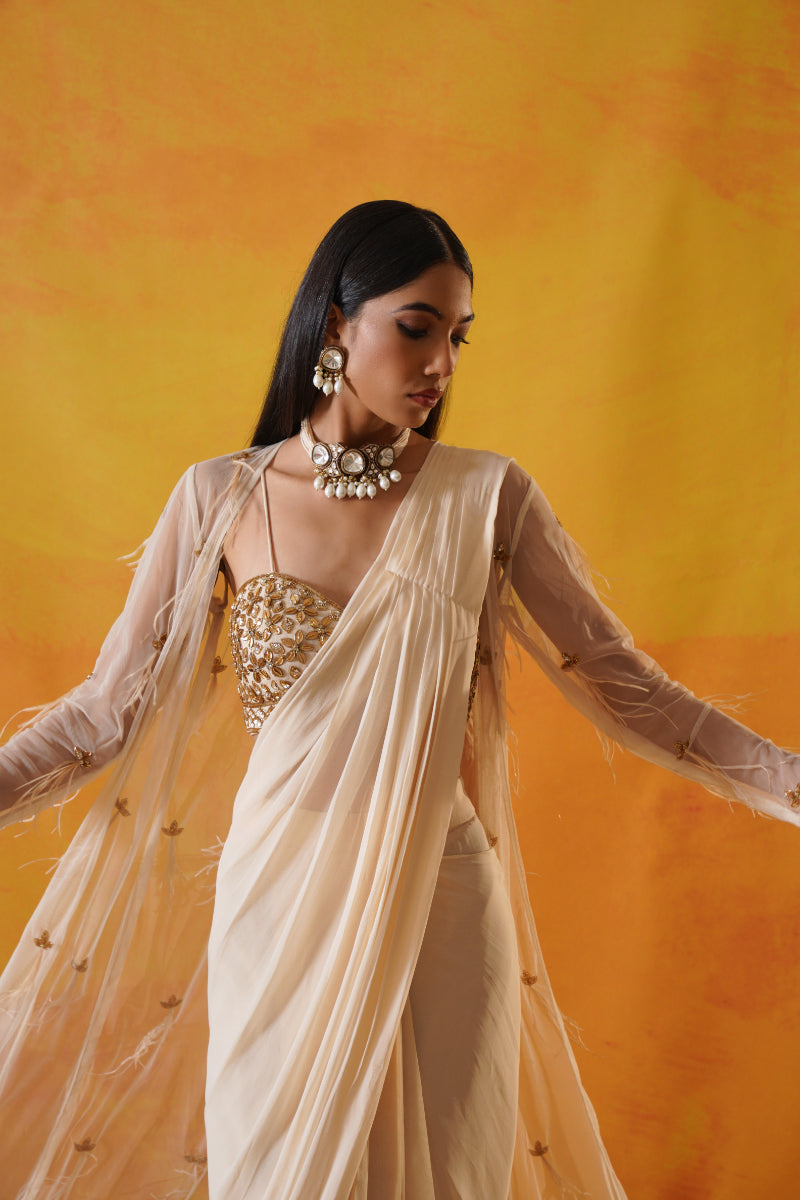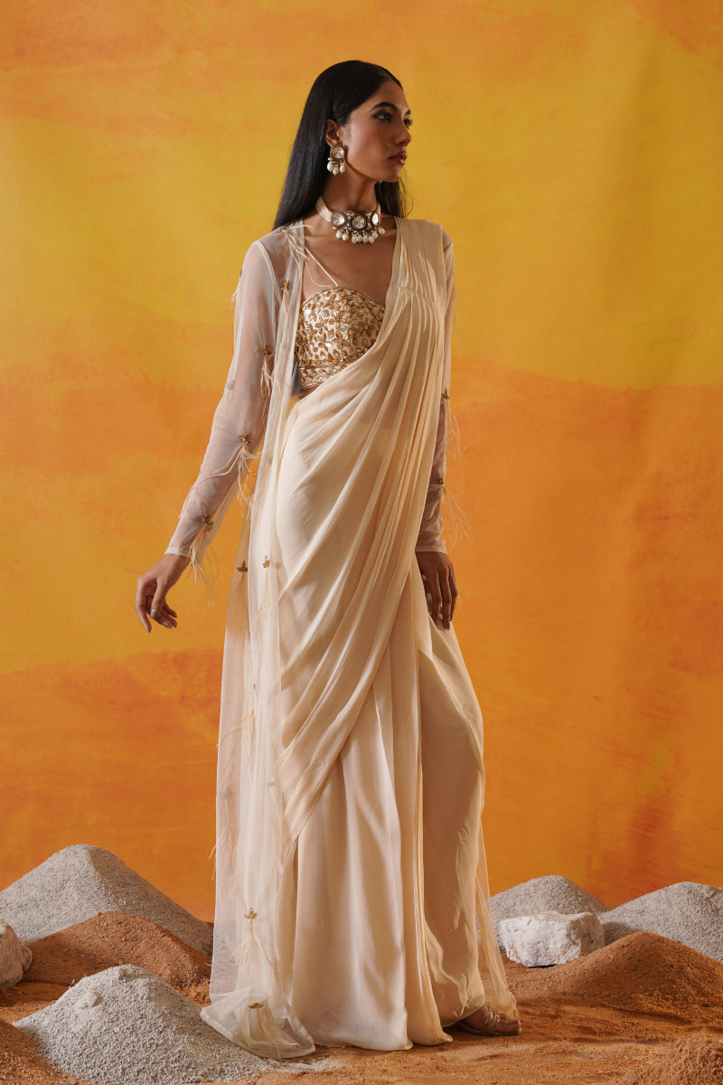 Kapda Dori's stunning ivory ready to wear geogratte ruffle saree. The ivory color adds a touch of glamour and sophistication to your look, while the soft georgette ensures you feel comfortable all day or night long. It is styled with a ivory geogratte blouse fully embroidered with cutdana, stones and sequins. Pair it with complimenting long soft net embroidered jacket with feather details.