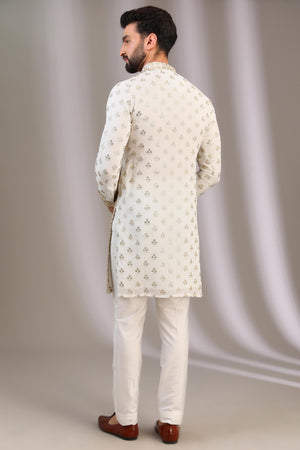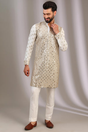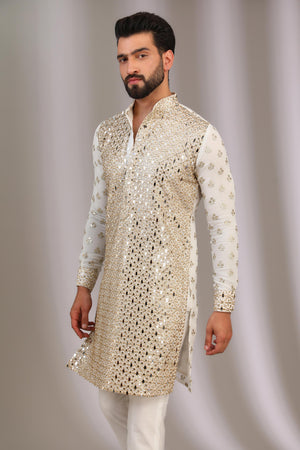 IVORY GORGETTE KURTA FRONT MIRROR WORK , BACK & SLEEEVS SEQAUIN BOOTI UNLINED KURTA W COTTON SILK PANT