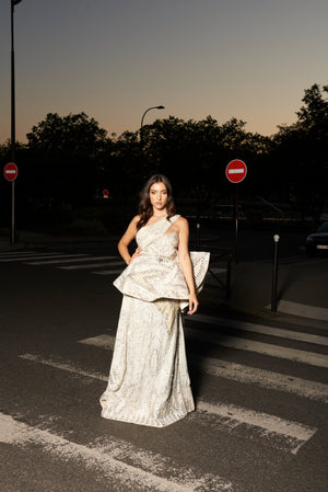 Ivory Glass Organza One-Shoulder Gown. Handcrafted with exquisite embroidery, it boasts a stunning silhouette that accentuates your figure.