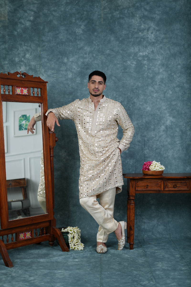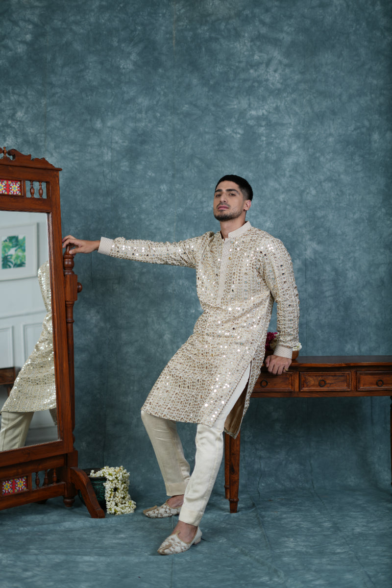 Featuring a Ivory kurta in chanderi base with mirror and sequins embroidery. It is paired with grey pants. Perfect attire for any festive occasion or sangeet ceremony, exuding charm and timeless elegance.