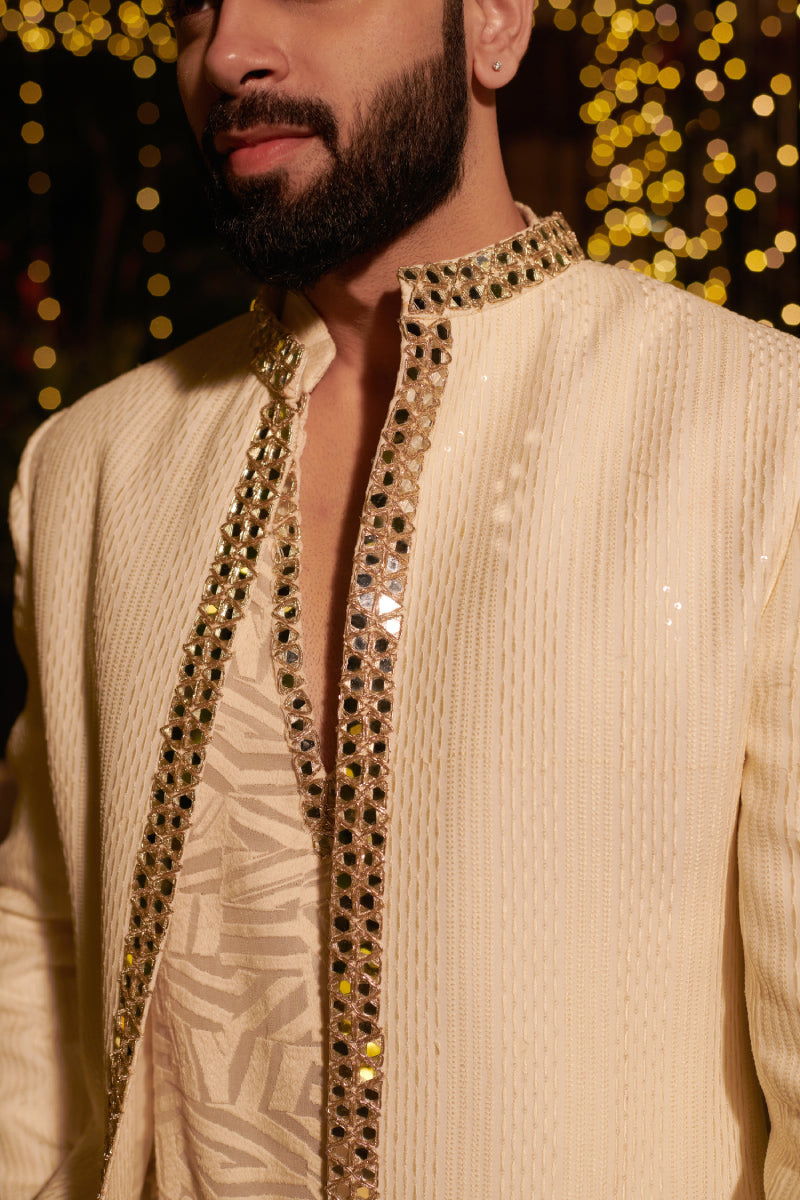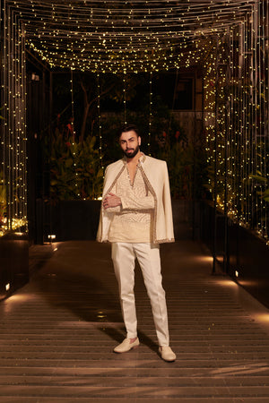 This Ivory Open Short Jacket Set is a stunning blend of modern sophistication and intricate craftsmanship. The open-front jacket and shirt are crafted from luxurious georgette fabric, featuring detailed thread handwork that adds depth and texture. The jacket’s borders are beautifully embellished with mirror work and gold zari, creating a captivating and opulent finish. Paired with Chanderi fabric pants, this ensemble offers a refined, graceful silhouette perfect for special occasions. The soft ivory hue enhances the outfit's timeless appeal, making it ideal for weddings, receptions, or festive gatherings. A perfect fusion of elegance, tradition, and contemporary design, this set is a must-have for the stylish, discerning individual.