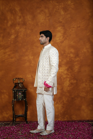 Featuring an ivory open jacket in blended silk base with embroidery. It is paired with a white cotton satin kurta and pants. Perfect attire for any festive occasion, wedding or engagement ceremony, exuding charm and elegance.