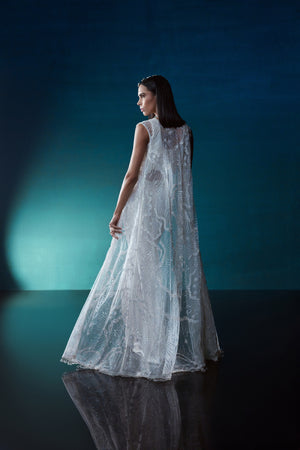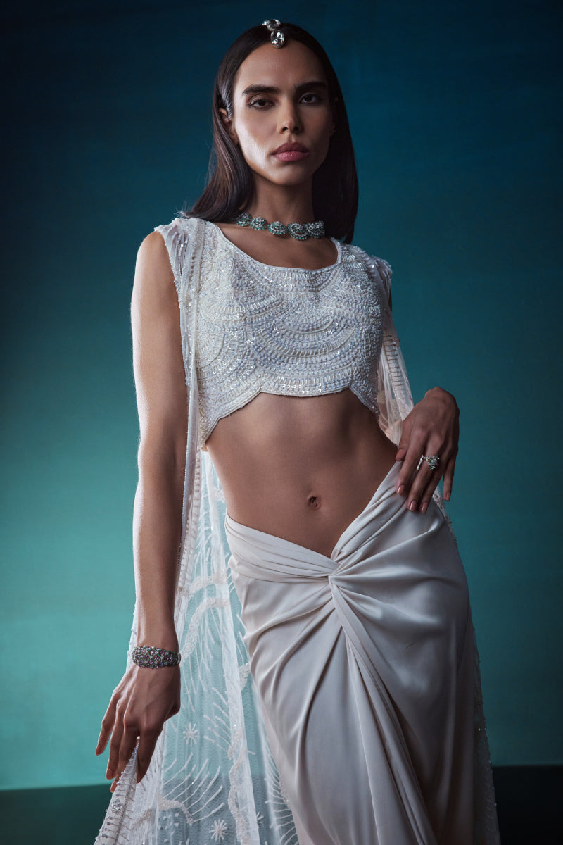 Ivory net jacket and satin skirt set with tonal pearl, bead and sequins embroidery paired with embroidered blouse