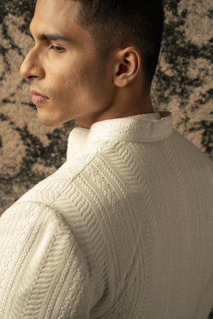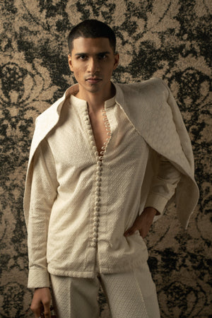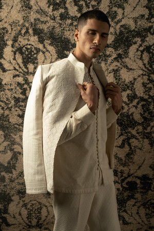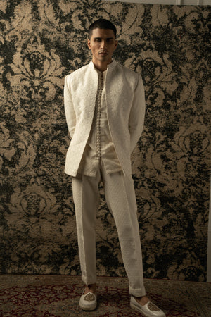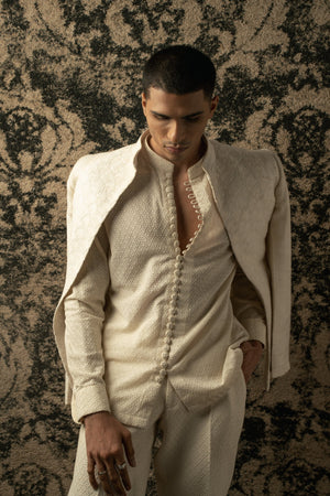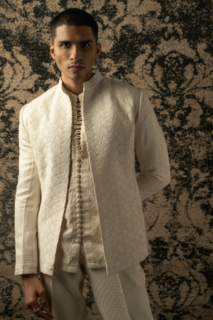 The ivory bandhgala exudes timeless elegance, crafted on silk. Its classic silhouette is adorned with intricate tonal thread embroidery, adding a touch of sophistication and refinement. Paired with a shirt boasting exquisite detailing on its buttons, the ensemble achieves a harmonious balance between tradition and modernity. Completing the ensemble are tailored pants, ensuring a seamless blend of comfort and style. This ensemble embodies understated opulence, perfect for special occasions or formal affairs where effortless charm is paramount.