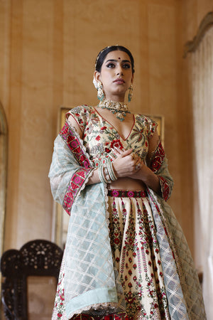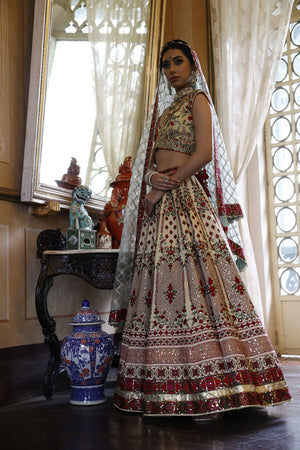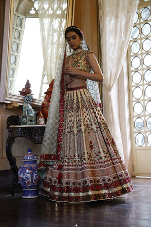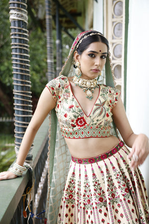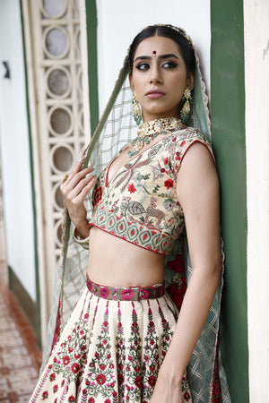 Lehenga: 24 kali, ivory coloured lehenga with red, pink and green embroidery and a 1 inch border around the waist. The bottom of the lehnega has two different 1.5 inch borders in green, pink and red resham and gold sequins seperated by a gold lumpi. | Choli: A pan-neck, cap sleeve choli with nature themed embroidery all over in red and green resham and zari and cutdana, with a pair of red tassles attached at the doris at the back. | Dupatta: Net with gold taping and 1.5 inch border and gold crochet border all around, along with two pairs of red tassles.
