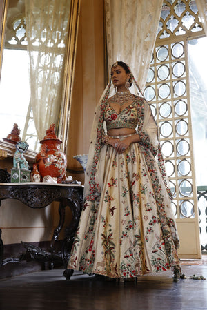 Lehenga: Ivory silk 24 kali lehenga with abstract story pattern thread work and zari embroidery | Choli: Ivory silk leaf shape neckline, cap sleeves choli with abstract story pattern thread work and jari embroidery | Dupatta: Ivory organza dupatta with 3" floral border