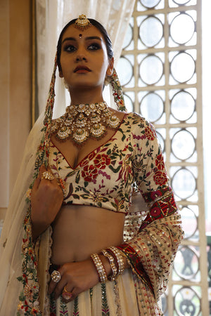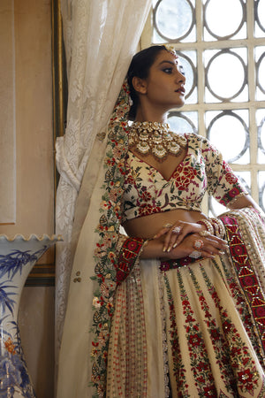 Choli: Ivory threadwork choli with gold cutdana paan neck choli with half sleeves. the sleeve has a 1" border on the hem with crochet border for finishing.The choli has red piping and red tassels attached to the dori at the back. | Lehenga: Ivory threadwork embroidered lehenga in kali form with 1 inch border on the waistbelt and 3 lines of border for the hem finishing, i.e; 2 inch geometric threadwork border, one inch lumpi and 2 inch border. | Dupatta: Ivory georgette with embroidery in colours, red,pink and green and gold work with 2 inch border and finished with crochet and blue fabric tassels.