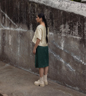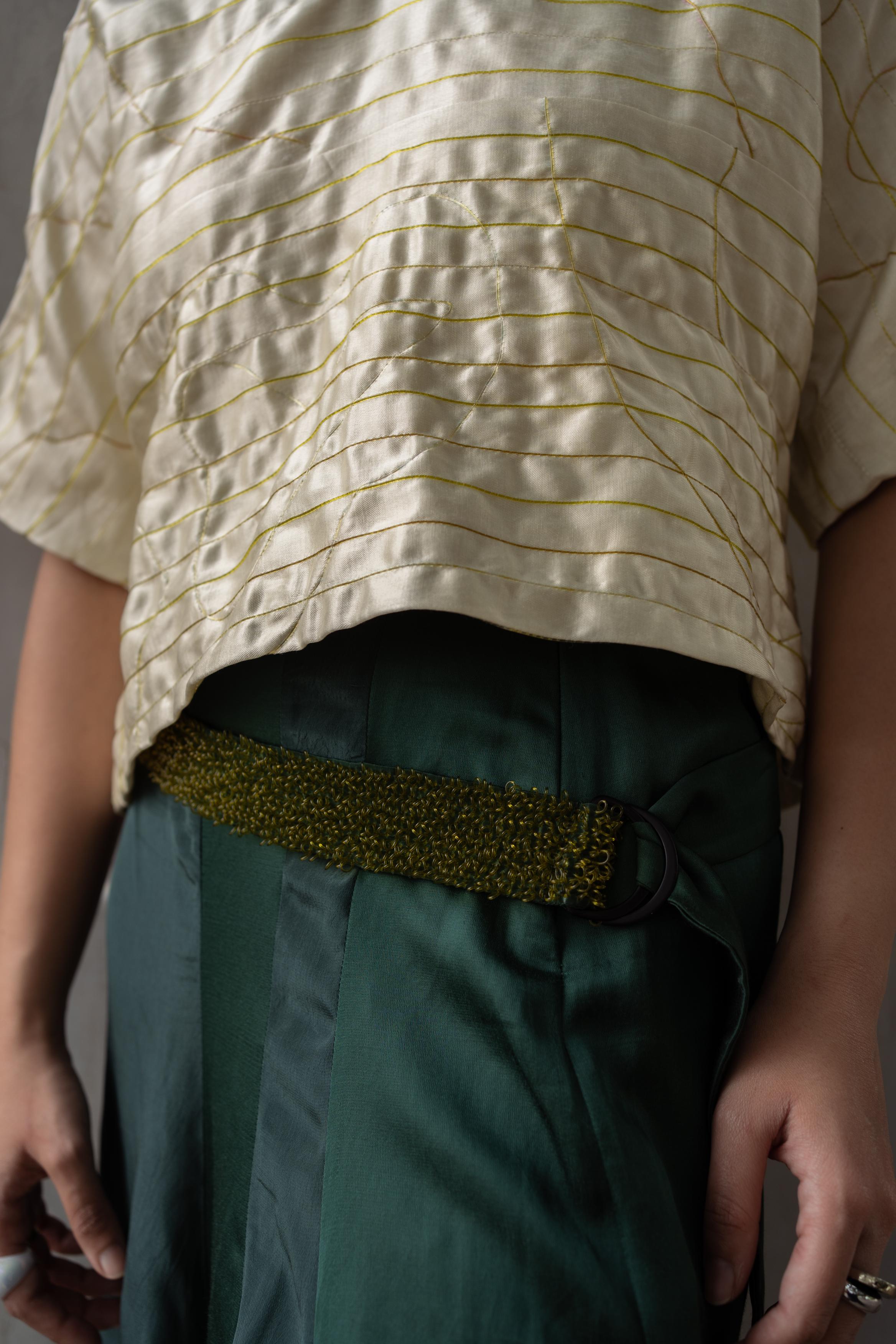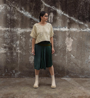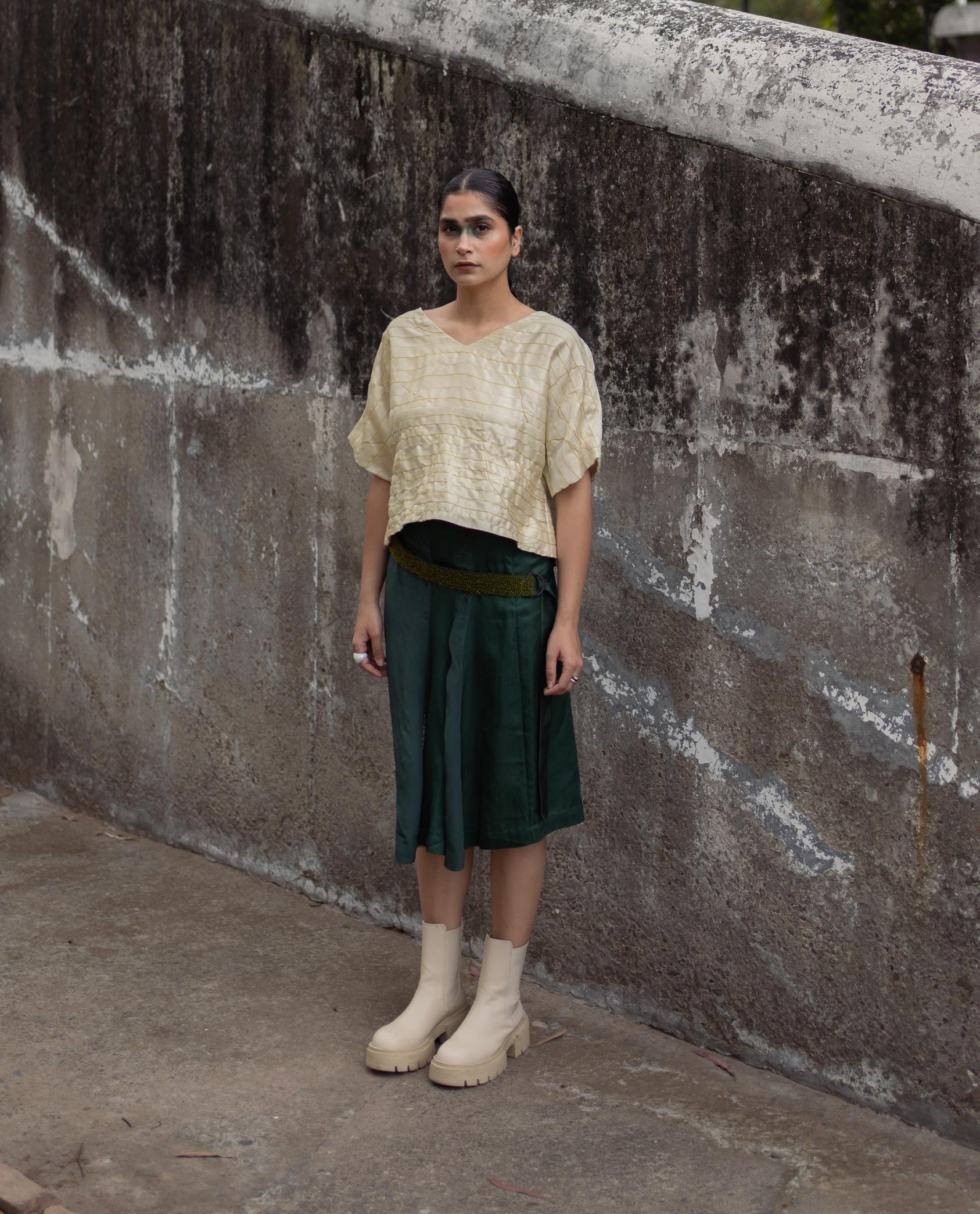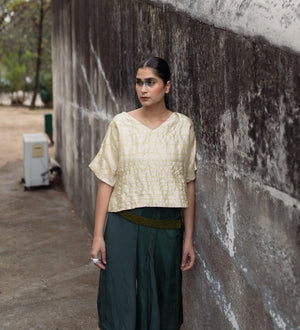 crop top features recycled pvc line stitch with abstract hand-embroidered motifs, broad v-neck , asymmetrical hem, easy fit, half sleeve length