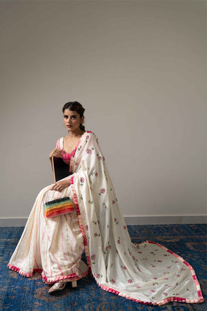 Ivory Marigold Hand French Knots Thread Work Embroidery Work Saree with Hand Painted Print and Stitched Patchwork Blouse