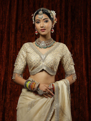 This beautiful Ivory saree with exquisite detailing of Badla, Kasab and Hyderabadi micro pearls. This saree is paired with matching blouse with gota, pearl and crystal drop detailing. This blouse beautifully complements the saree providing the outfit a classic look!