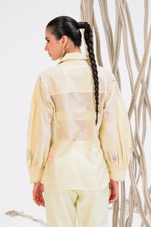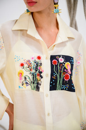 Turn heads and spark conversations with the Ivory Pop Shirt, a pastel magnolia masterpiece in premium Chanderi. This design dazzles with two bold black-and-white floral patches, enhanced by 3D sequin handwork and vibrant beads. The balloon sleeves amplify the look with sequin florals and a splash of colorful beads. Multicolor self-stitching along the seams and matching fabric buttons complete this shirt’s playful, artistic flair.