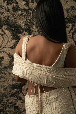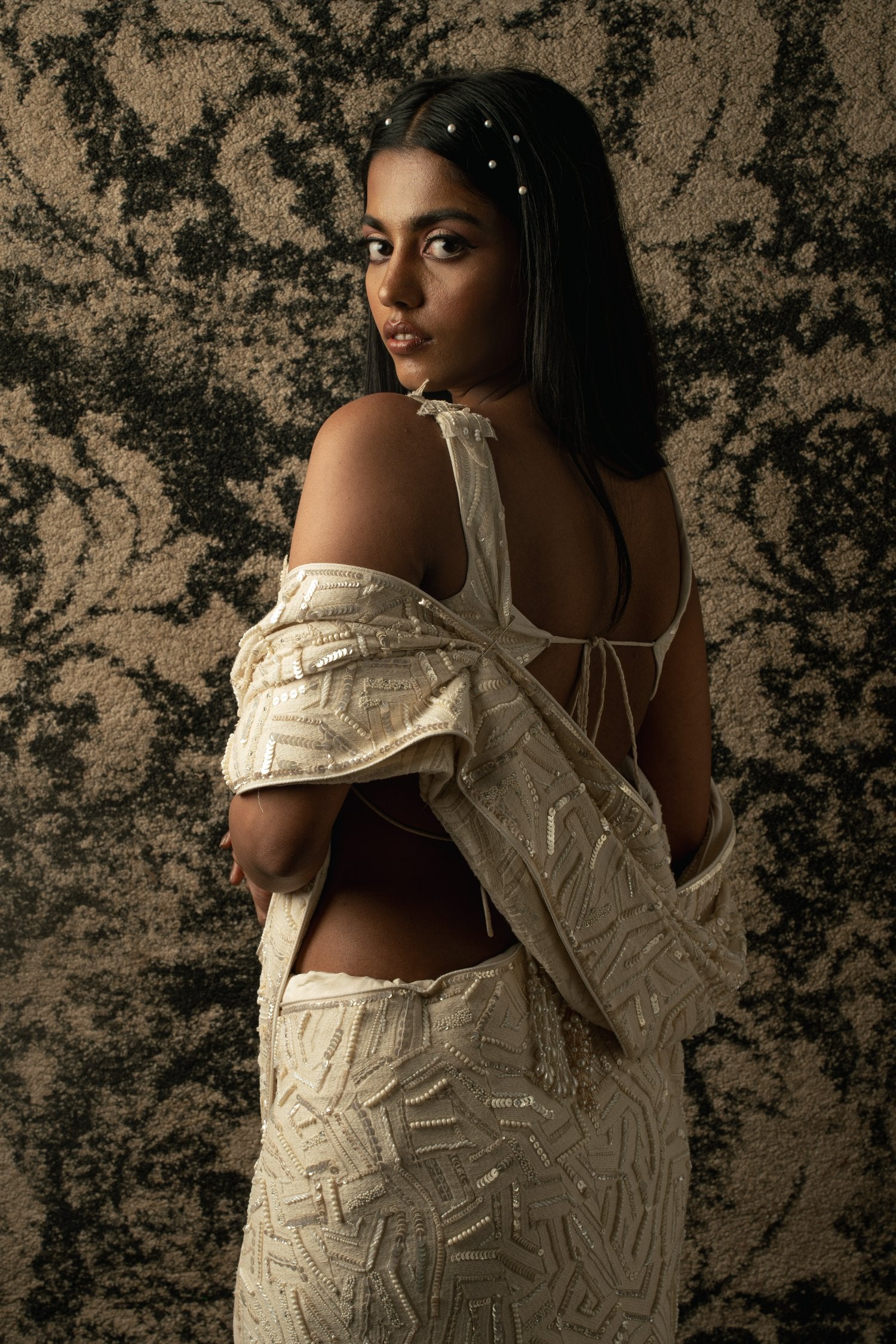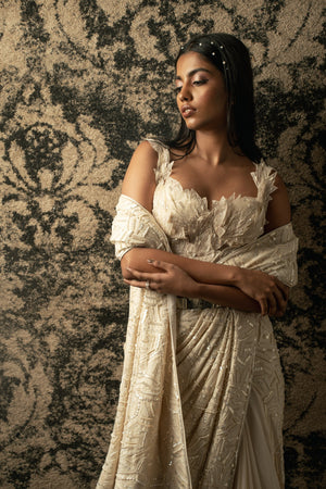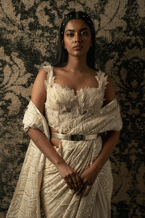 This Ivory traditional Indian saree takes on a modern allure with its innovative design. Crafted from the finest Silk Satin and georgette base, the saree drapes luxuriously, exuding opulence with every fold. The blouse, made from delicate net fabric, features intricate thread embroidery, adding a contemporary edge to the ensemble. Together, these elements blend tradition with modernity, creating a timeless yet fashion-forward statement piece that is sure to captivate attention at any