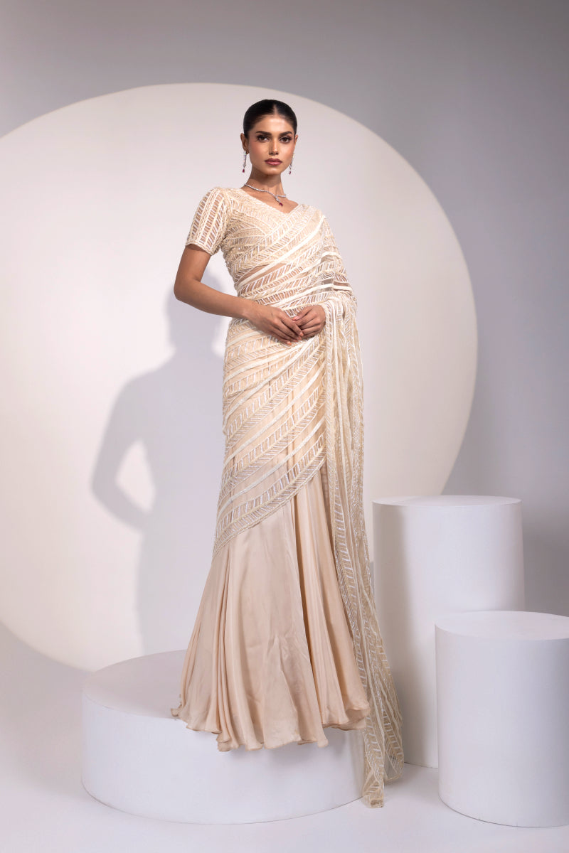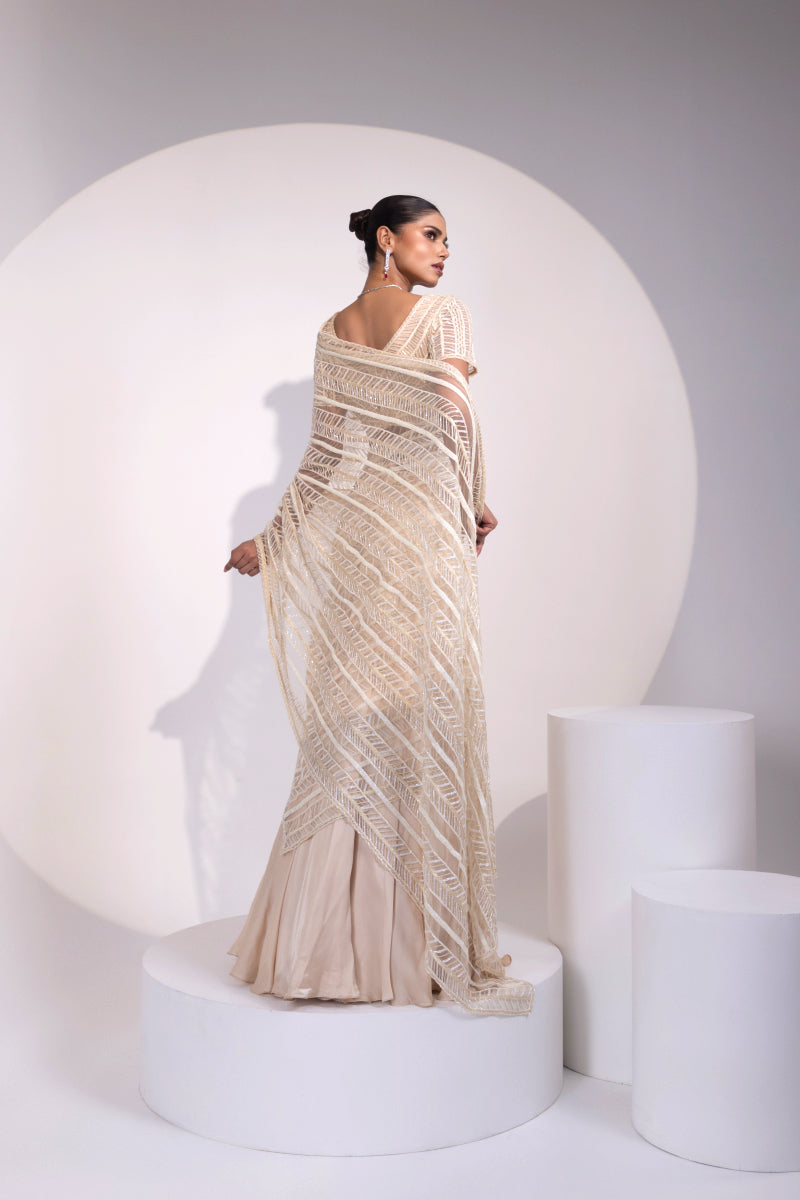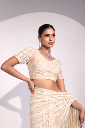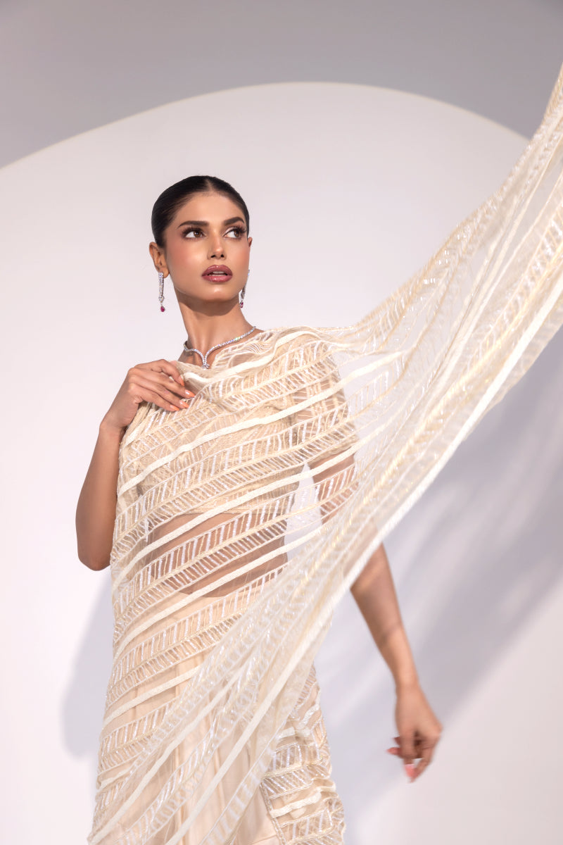 Ivory Sequin Embroidered Saree with Matching Blouse