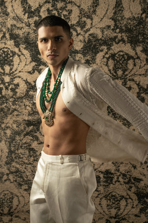 An ivory silk georgette ensemble, boasting intricate textured tonal embroidery, creates a fabric illusion while being meticulously hand-embroidered, offering a blend of elegance and craftsmanship in every stitch.