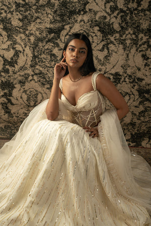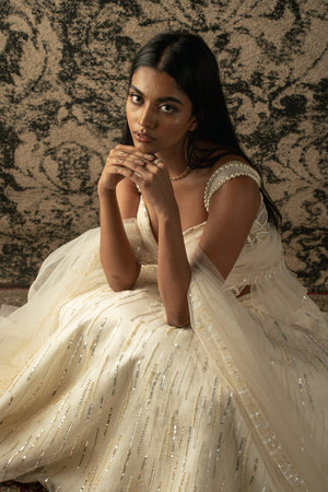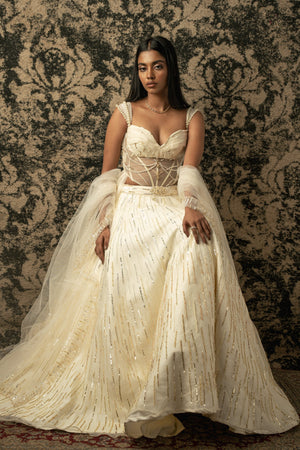 This exquisite lehenga set embodies sheer grace and sophistication. The skirt, crafted from Silk Organza with a luxurious Habutai silk lining, cascades elegantly, enhancing every movement with its ethereal charm. The blouse, delicately adorned with Organza and net, adds a touch of subtle allure and shimmer to the ensemble. Completing the look is a graceful cape crafted from lightweight net fabric, enveloping the wearer in an aura of timeless elegance. Together, these elements form a stunning ensemble that epitomizes grace and refinement, perfect for any special occasion.
