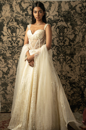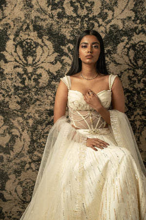 Fabric: Skirt- Silk Organza with Habutai silk lining, Blouse-Organza and net, Cape- Net