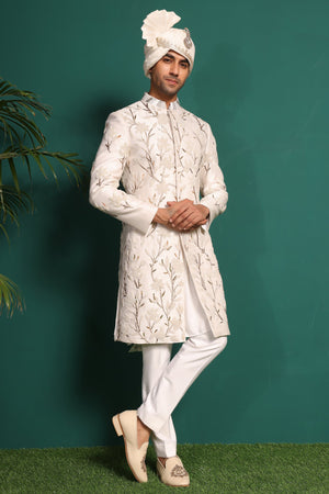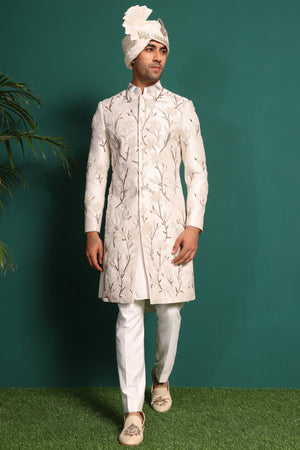 Elegance personified in our Ivory White Raw Silk Sherwani, adorned with opulent and heavy embellished work. This regal ensemble is designed to make a statement, perfect for those who seek sophistication with a touch of grandeur.