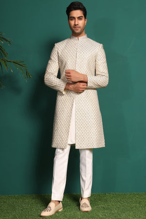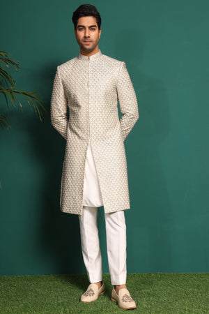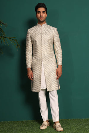 Indulge in resplendent luxury with our Ivory White Sherwani, adorned in lavish moti and cutdaana embellishments. Experience opulence redefined for your special day, where elegance meets grandeur in a symphony of exquisite details.