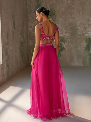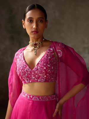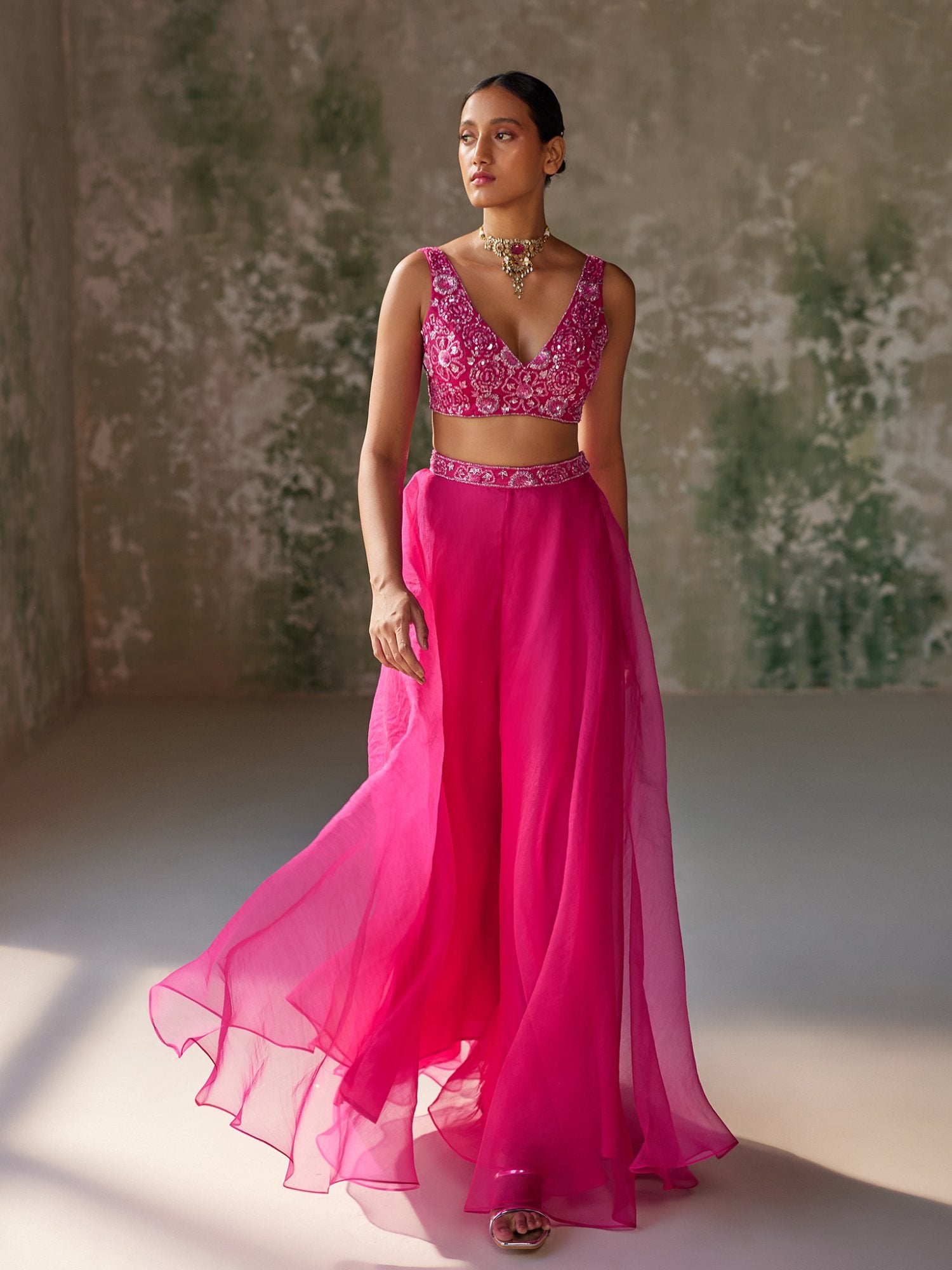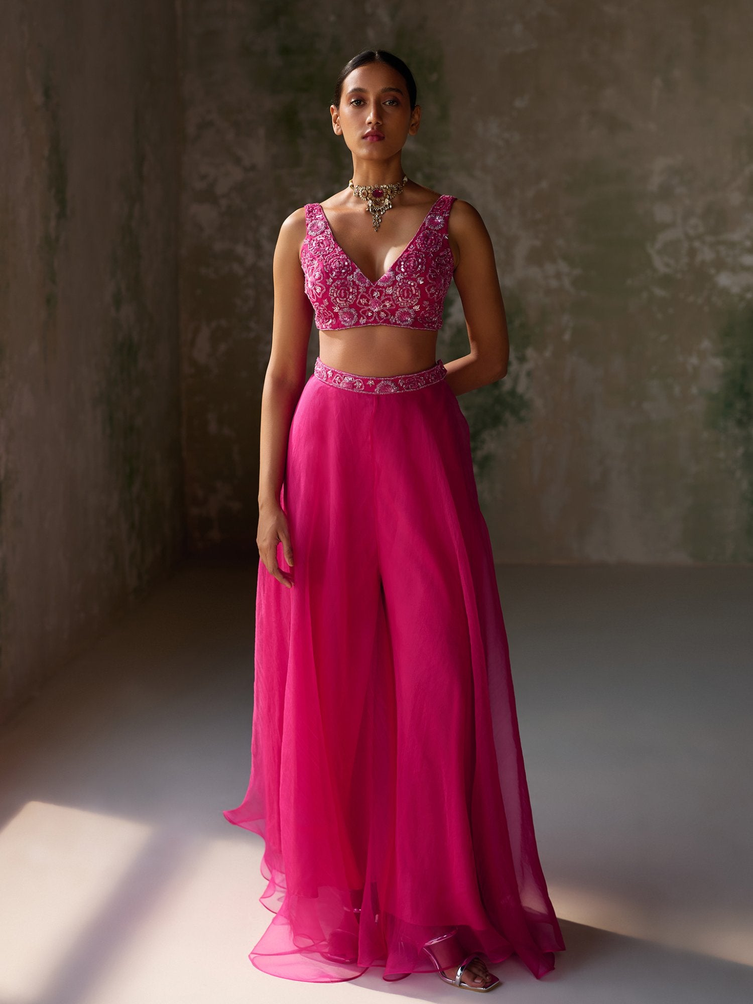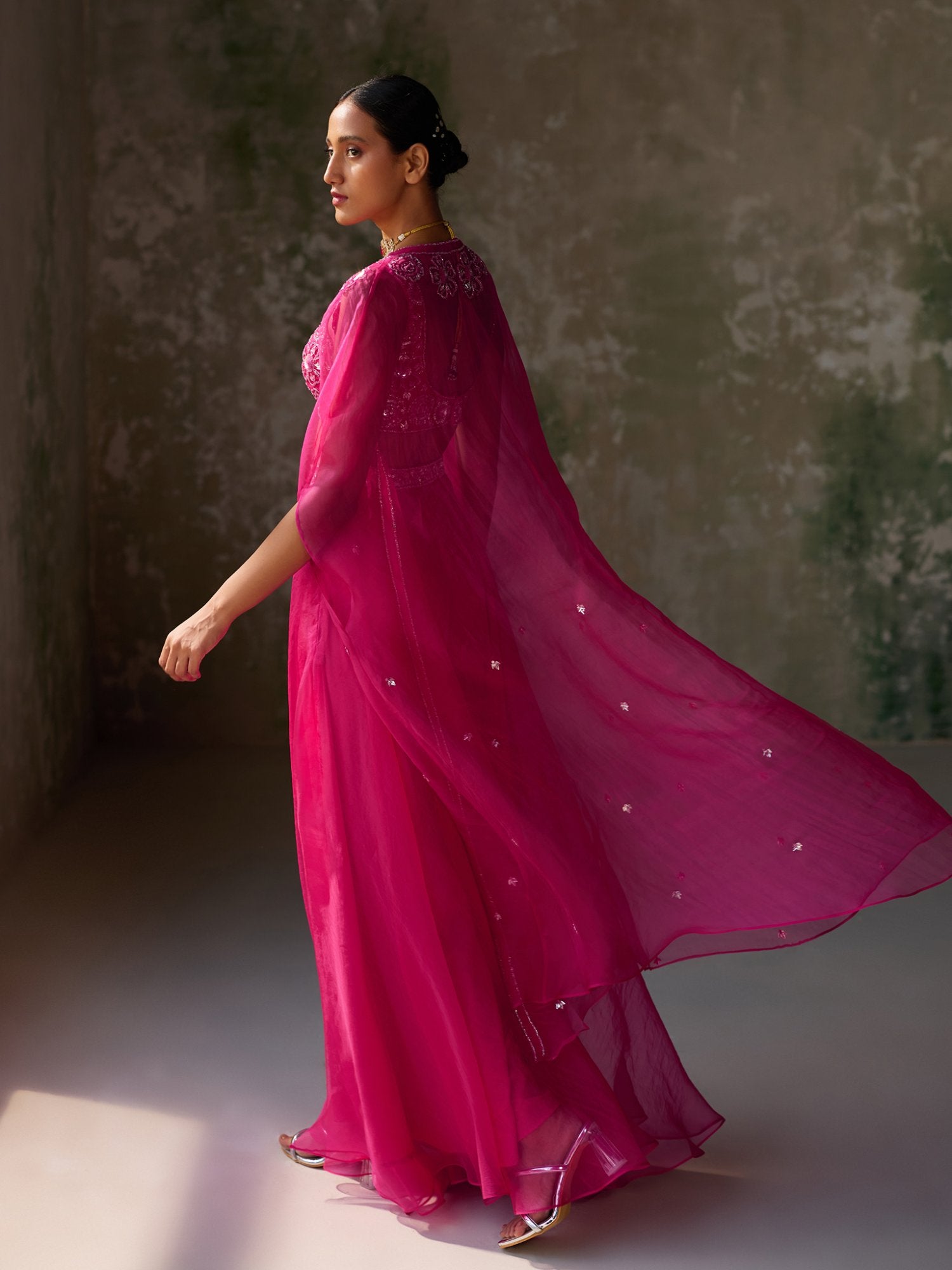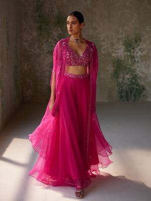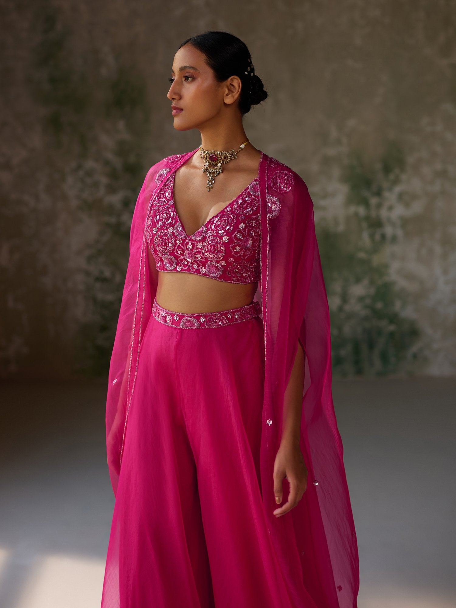 Featuring a hot pink cape jacket in pure silk organza with intricate hand-embroidery. It is paired with a matching hot pink blouse with all over hand-embroidery. It comes with pallazo pants in pure silk organza.