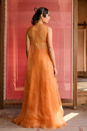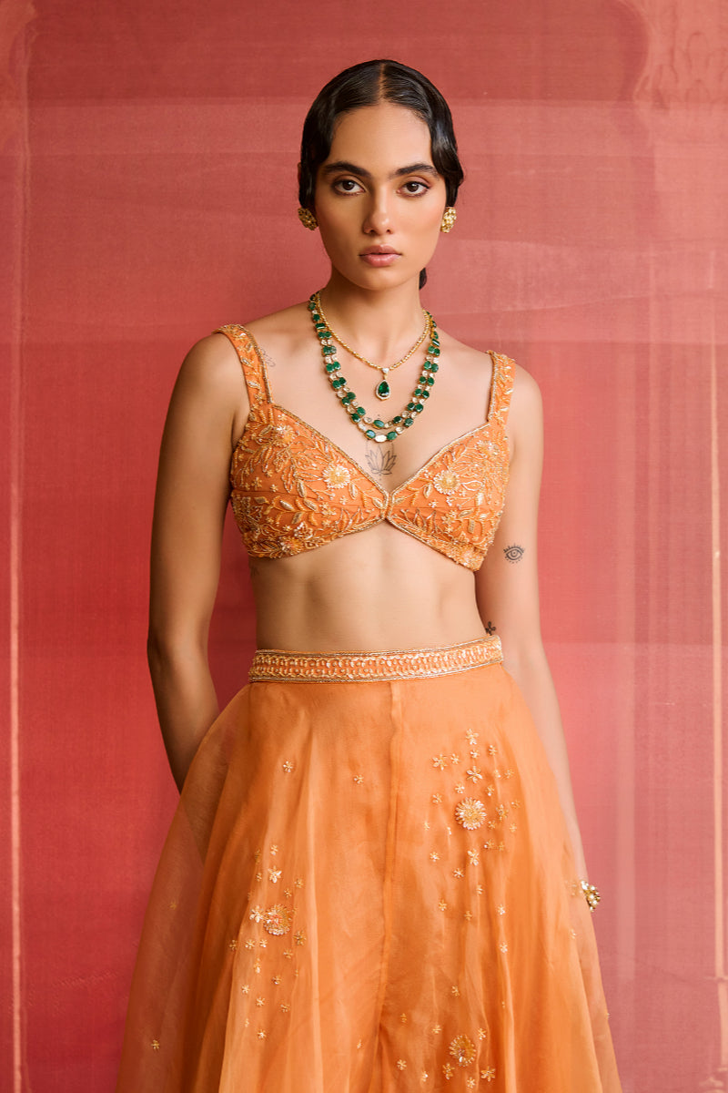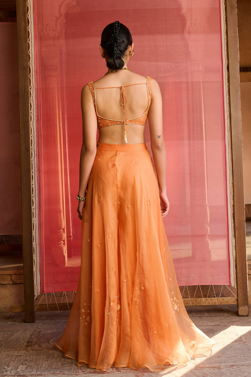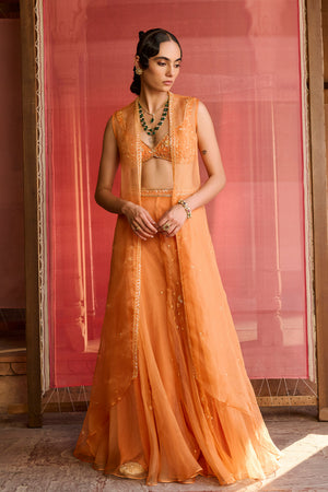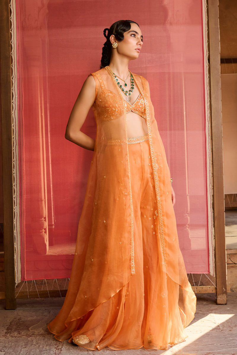 Featuring an orange color jacket in organza with hand embroidery paired with a net blouse with with heavy hand embroidery. Paired with pallazo pants in circle with hand embroidered motifs all over the pants.